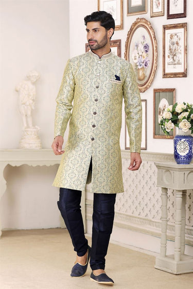 Pretty Jacquard Fabric Readymade Men Indo Western In Beige Color