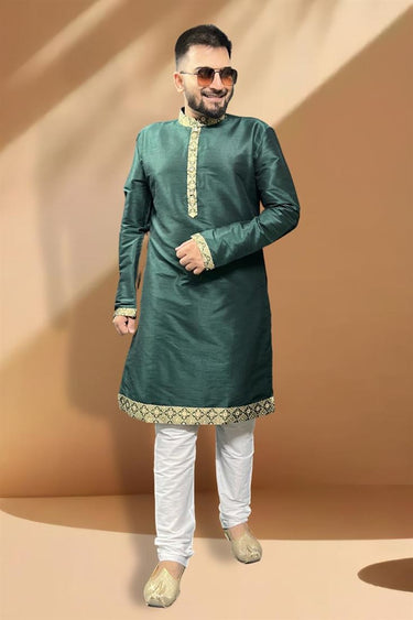 Pretty Silk Fabric Sangeet Wear Readymade Men Kurta Pyjama In Teal Color