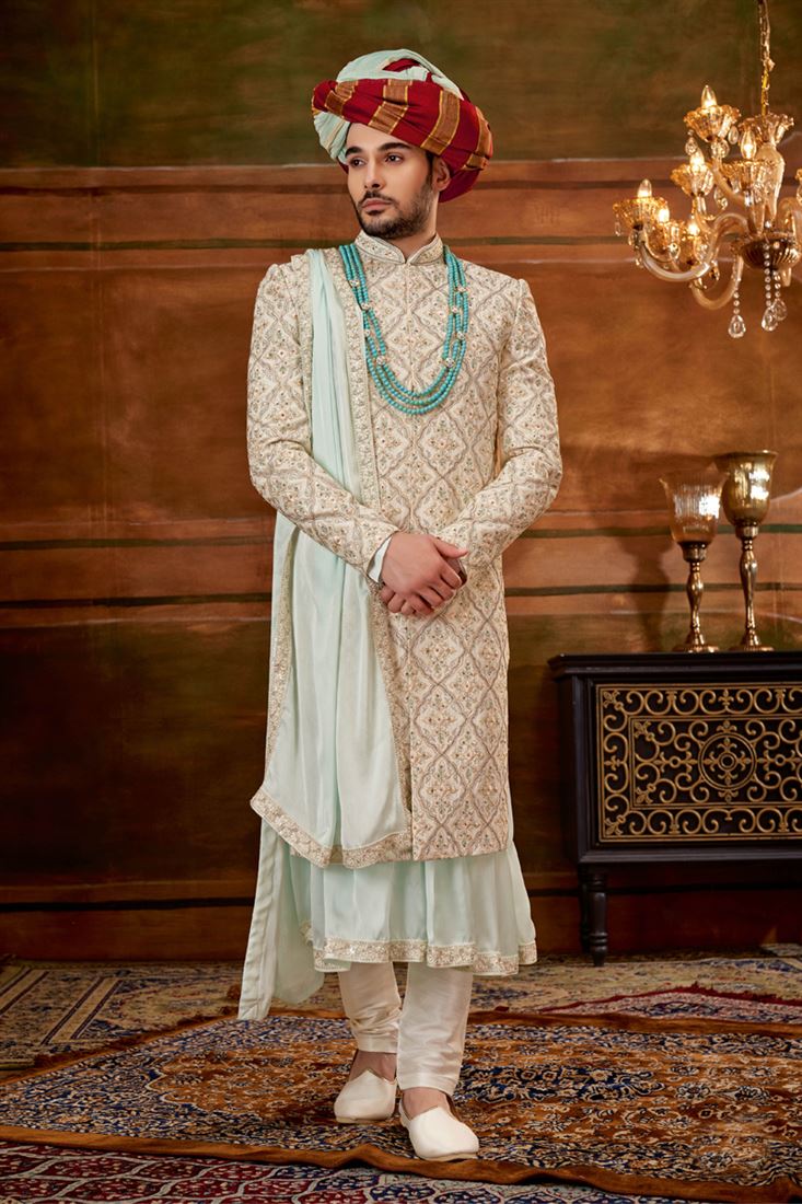 Pretty Silk Fabric Wedding Wear Readymade Men Heavy Embroidered Groom Sherwani In Beige Color With Stole