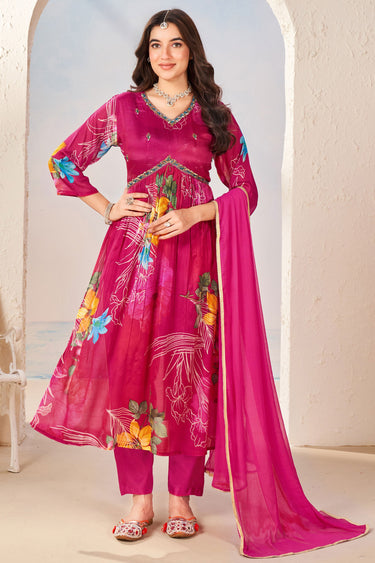 Printed Chinon Fabric Readymade Anarkali Suit In Rani Color
