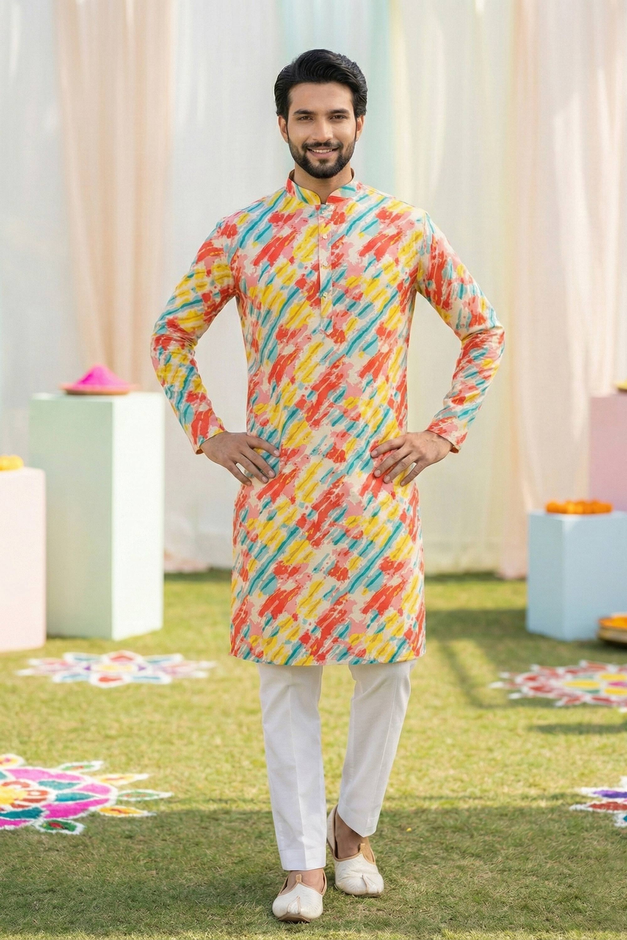 Printed Cotton Fabric Multi Color Readymade Kurta Pyjama For Men