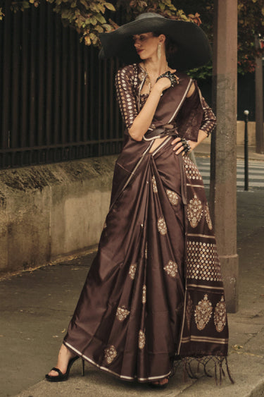 Pure Satin Silk Fabric Brown Color Handloom Zari Weaving Work Festive Wear Trendy Saree