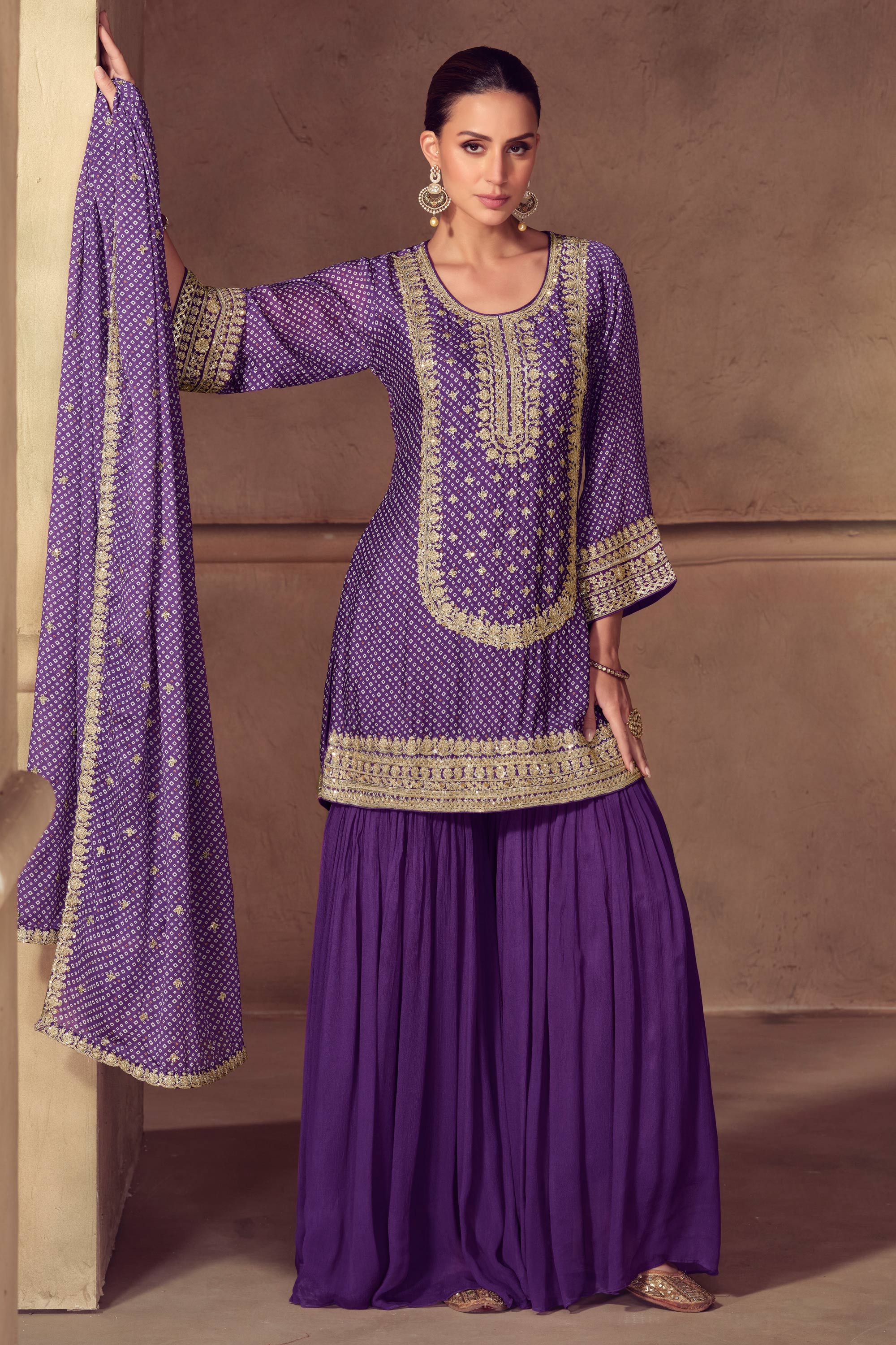 Purple Chinon Embroidered Readymade Sharara Salwar Suit