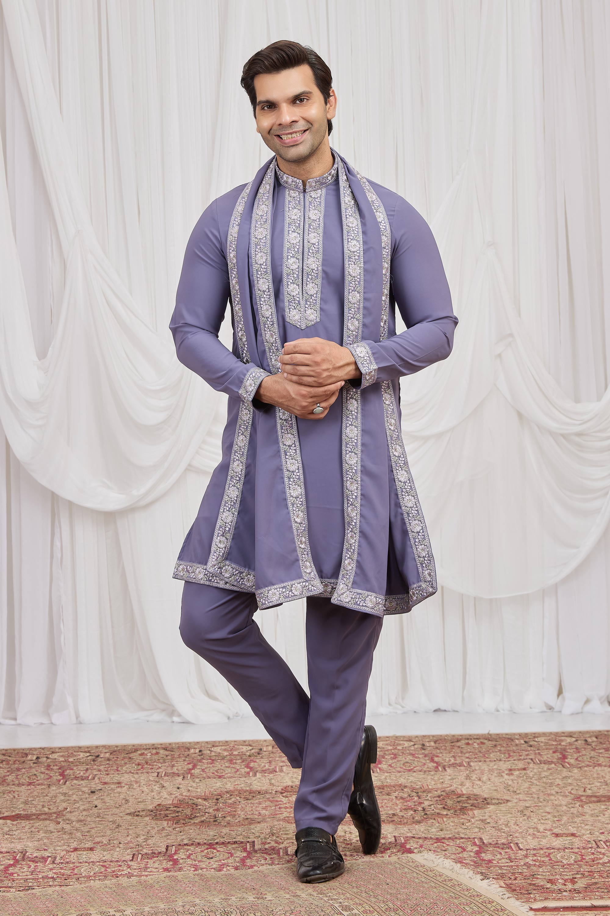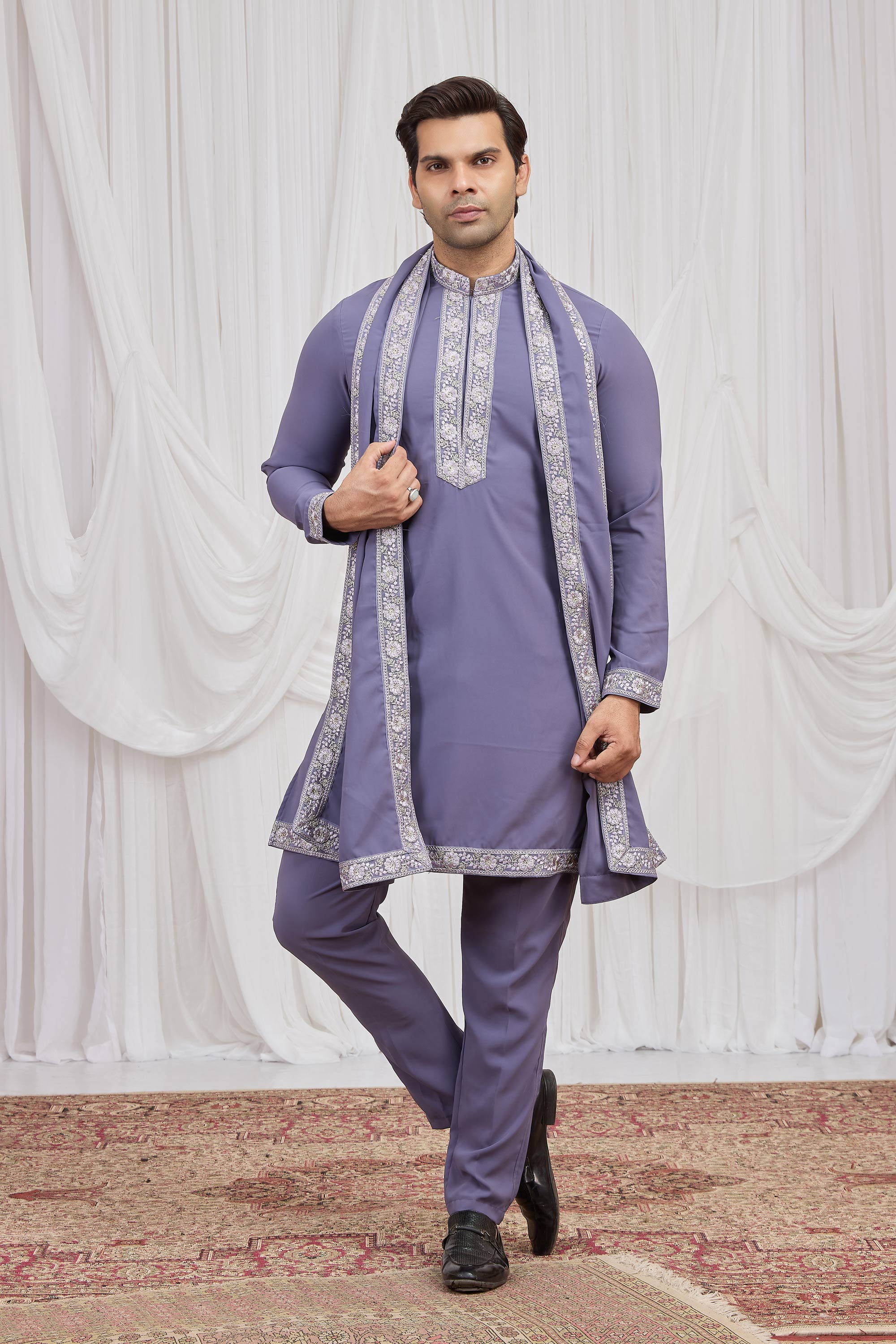 Add a touch of tradition to your wardrobe with this Mens Kurta Pyjama set made from superior fancy fabric. The straight kurta is designed with elegant embroidery work that highlights its festive essence, while the matching dupatta completes the ethnic ensemble. The Aligadhi pant, also crafted from fancy fabric, ensures a comfortable yet stylish fit. The rich color enhances its luxurious appeal, making it ideal for functions and special occasions. Slight color variations may occur due to digital photography.