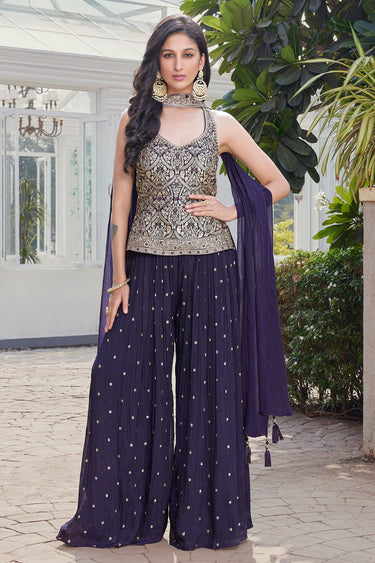 Elevate your wardrobe with our Purple Silk Indo Western Palazzo with Long Top. Made from high-quality silk, this ensemble combines the traditional palazzo pants with a stylish long top, creating a unique blend of modern and classic fashion. The deep purple color adds a touch of elegance, making it perfect for both casual outings and special occasions. The comfortable fit and breathable fabric ensure all-day comfort, while the intricate design details add an element of sophistication. Pair it with your favorite accessories and step out in style.