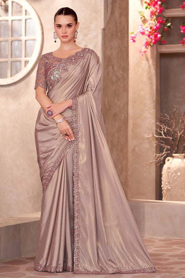 Radiant Border Work On Beige Color Crepe Silk Fabric Saree