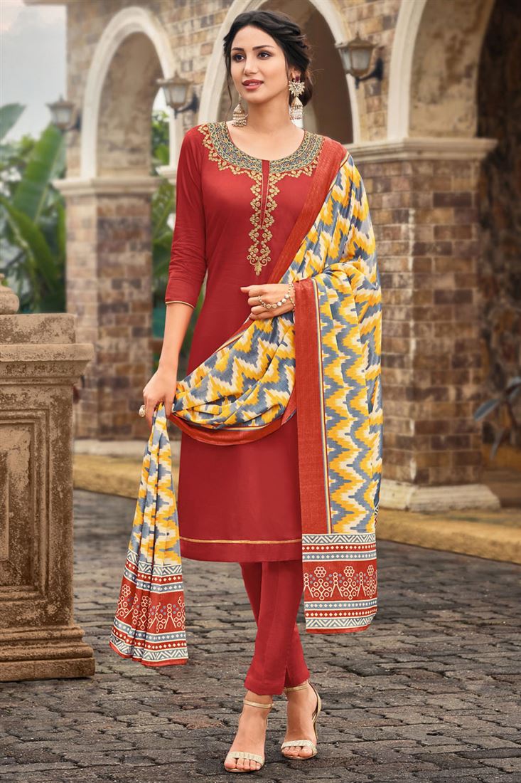 Radiant Red Color Cotton Fabric Casual Look Salwar Suit
