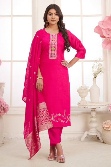 Experience the luxury of our Viscose Silk Reach Color Straight Cut Salwar Suit With Dupatta. Made from high-quality viscose silk, this outfit offers unmatched comfort and style. The straight cut design ensures a flattering fit, making it perfect for various occasions. The rich colors add a vibrant touch to your wardrobe, while the matching dupatta enhances its elegance. Pair it with your favorite accessories to complete the look. Ideal for festive events, weddings, or casual gatherings, this salwar suit is a versatile addition to any wardrobe.