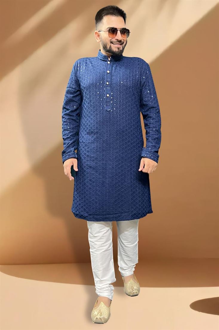 Rayon Fabric Blue Color Festive Wear Trendy Readymade Men Kurta Pyjama