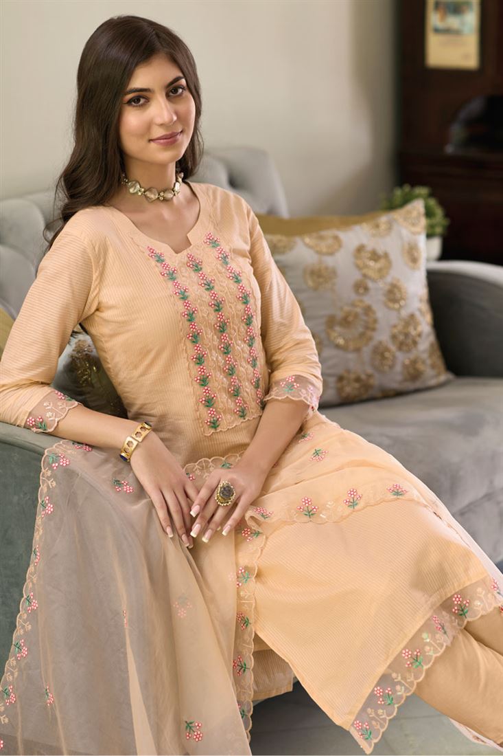 Stay chic and comfortable with this casual cotton cream color salwar kameez featuring beautiful embroidery. Made from breathable cotton fabric, this readymade outfit offers a blend of style and comfort, perfect for your casual outings.