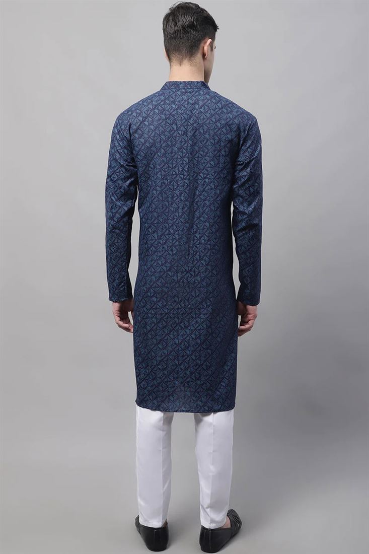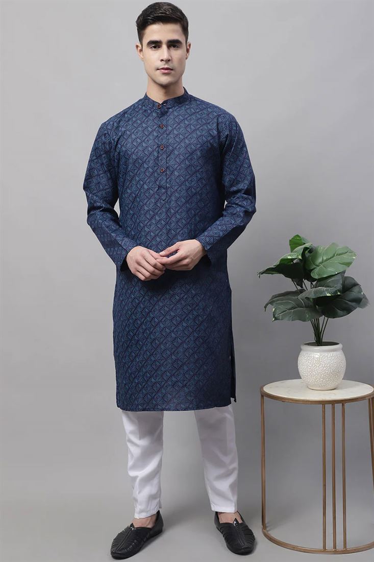 Readymade Navy Blue Color Cotton Fabric Festival Wear Royal Kurta Pyjama For Men