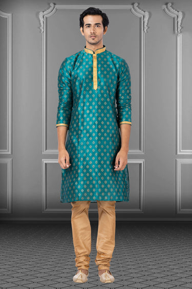 Reception Wear Attractive Readymade Kurta Pyjama For Men In Teal Dhupion Fabric