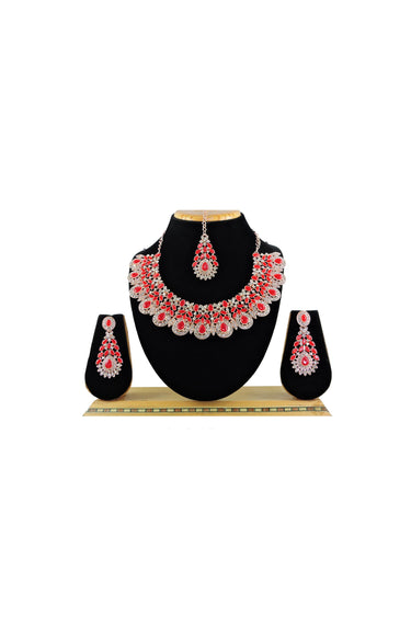 Red Color Glorious Alloy Material Necklace with Earrings and Mang Tikka
