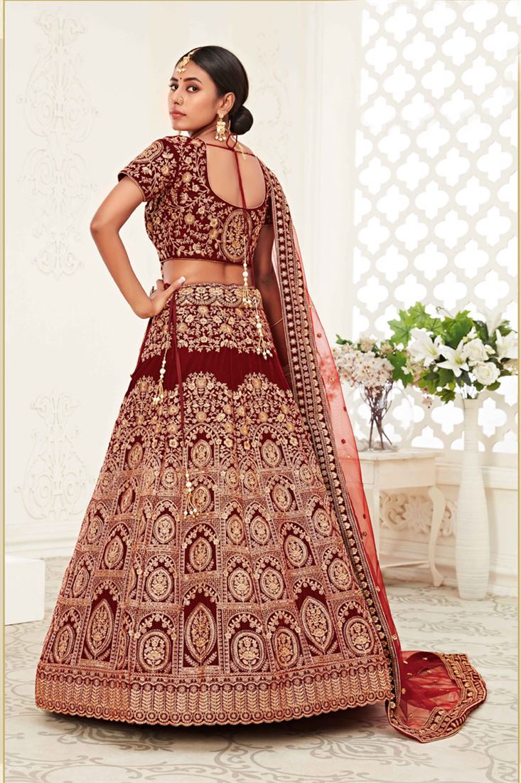Red Color Reception Wear Velvet Fabric Embroidered Lehenga Choli
