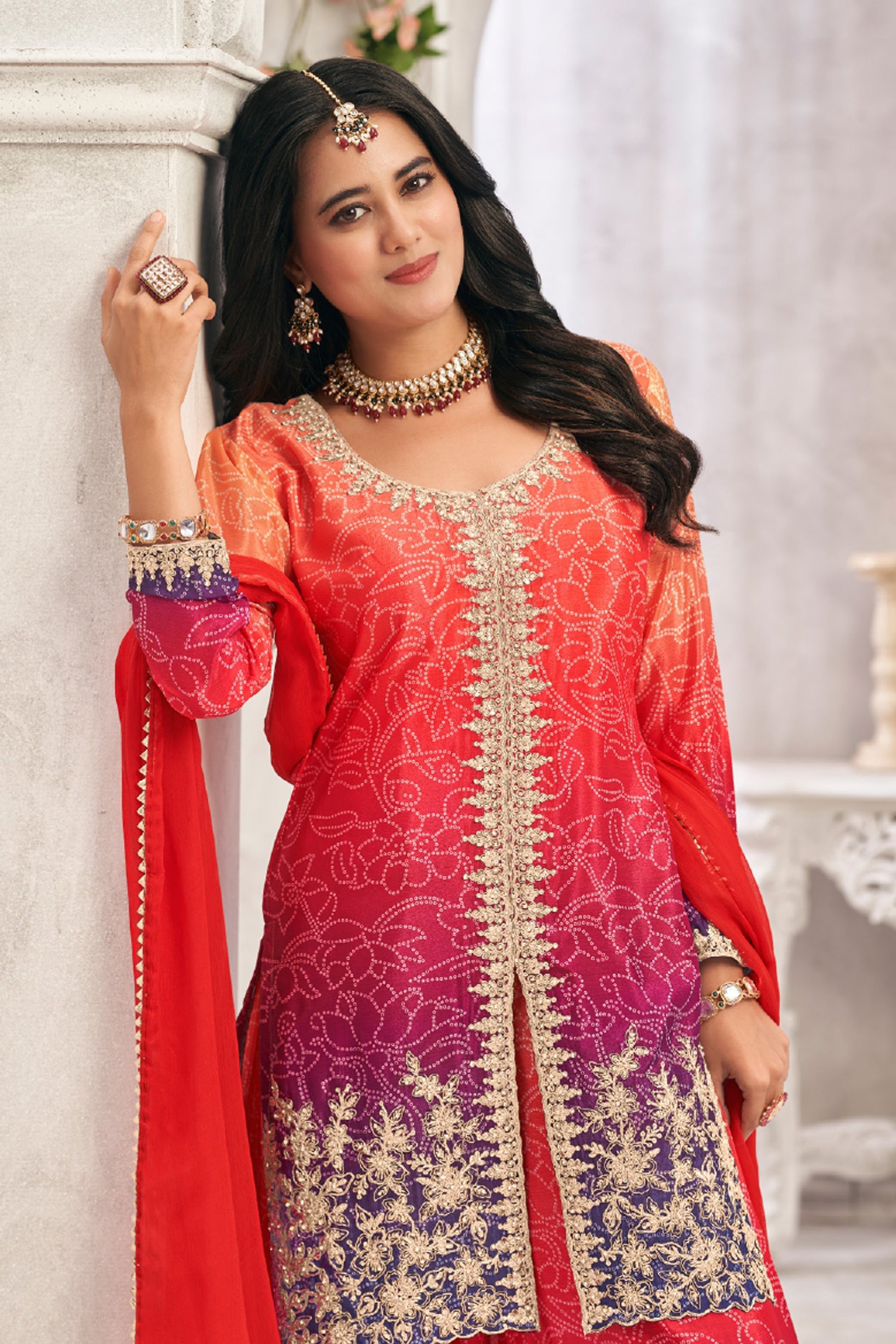 Red Embroidered Chinon Readymade Palazzo Style Suit