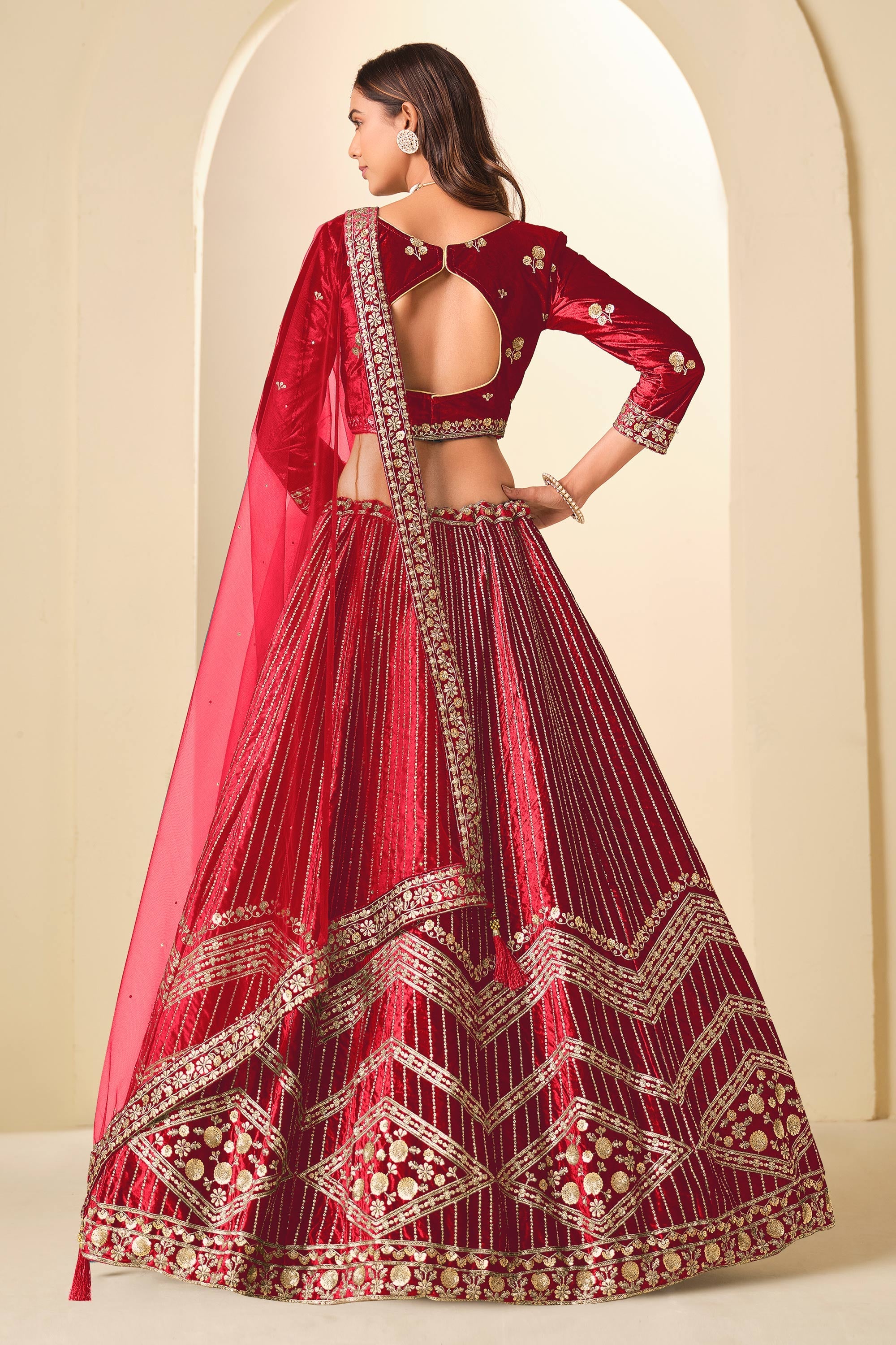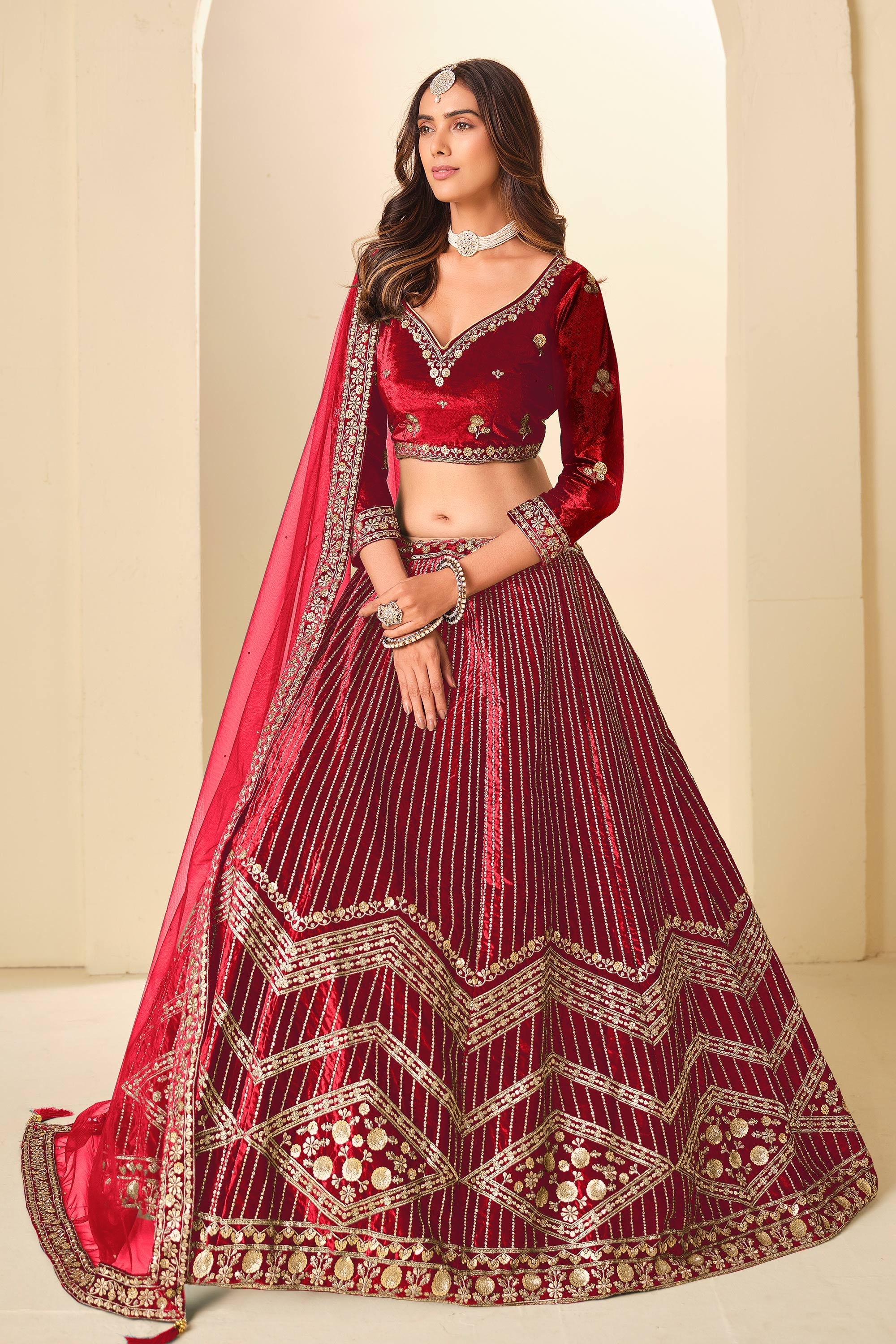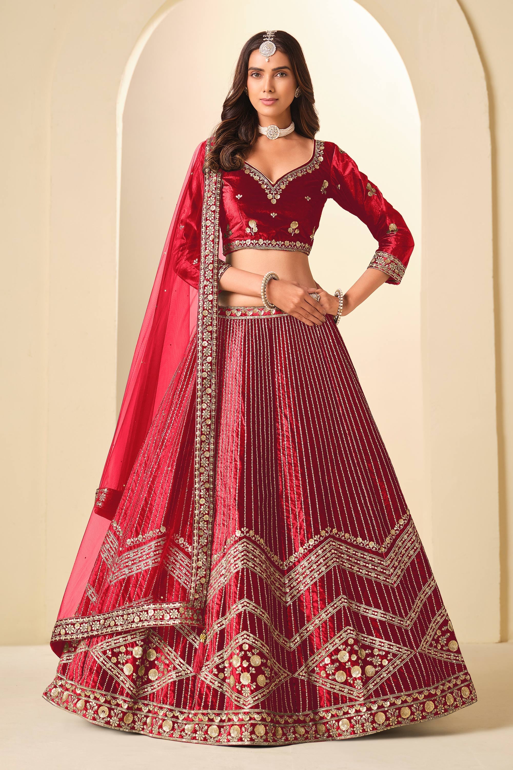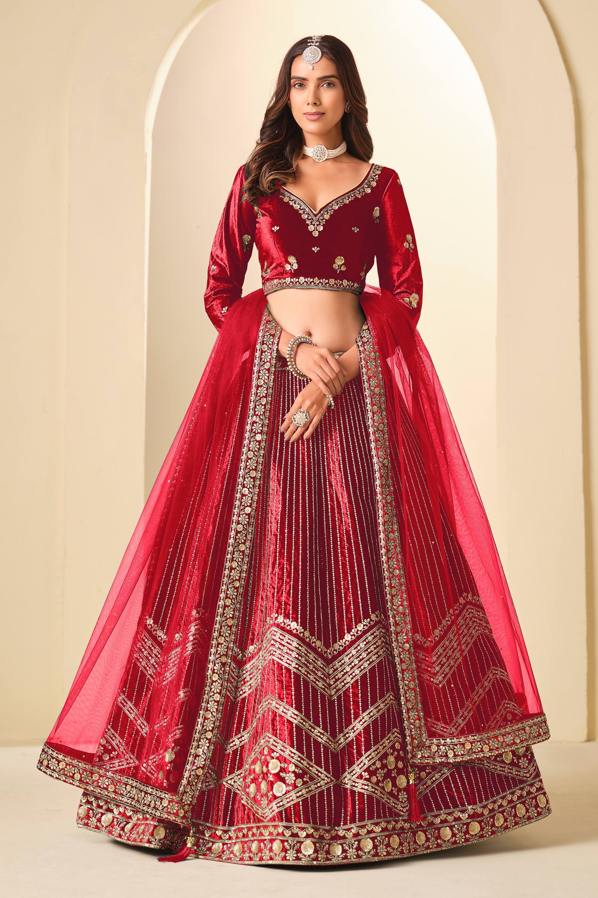 Red Wedding Wear Velvet Embroidered Lehenga Choli