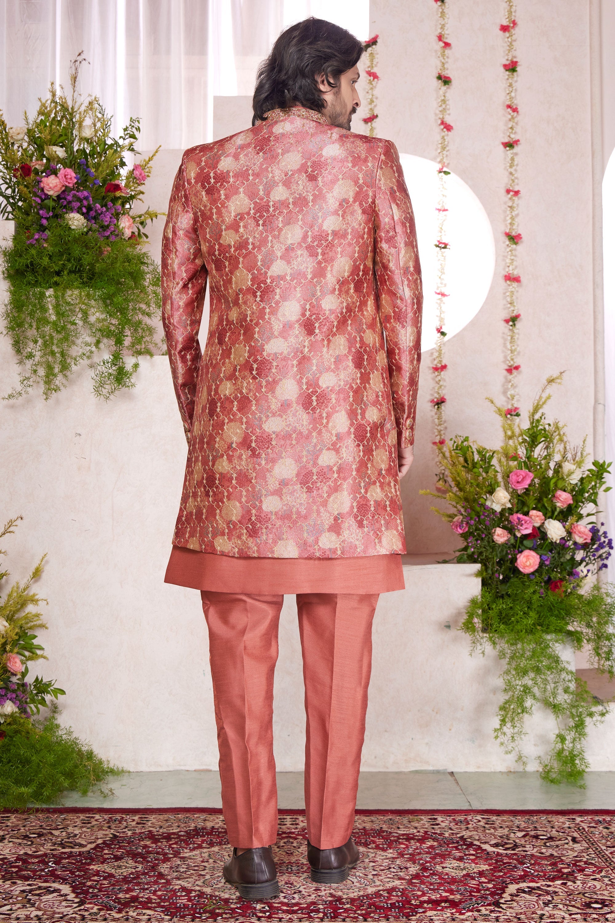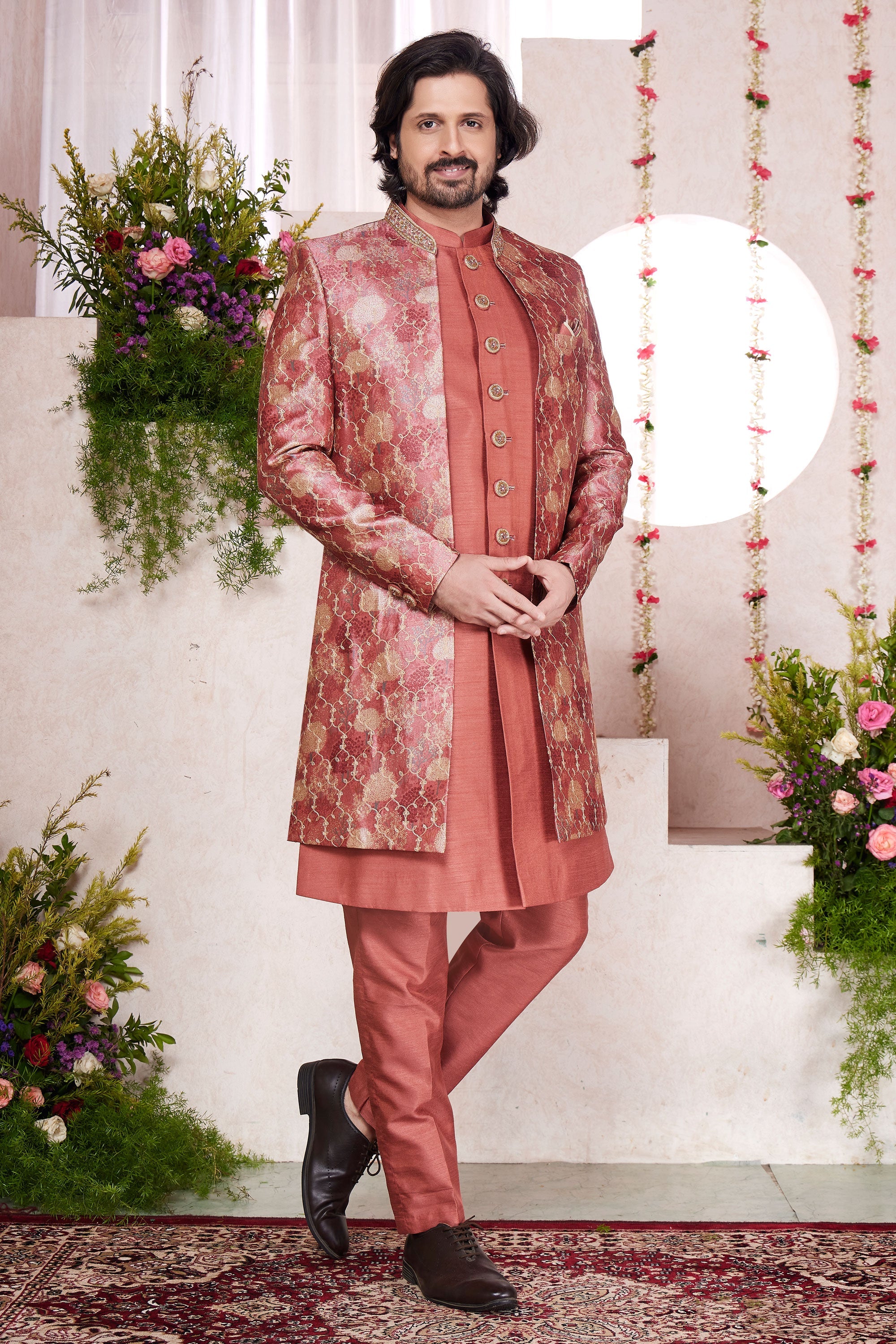 Rust Silk Wedding Wear Trendy Readymade Indo Western For Men