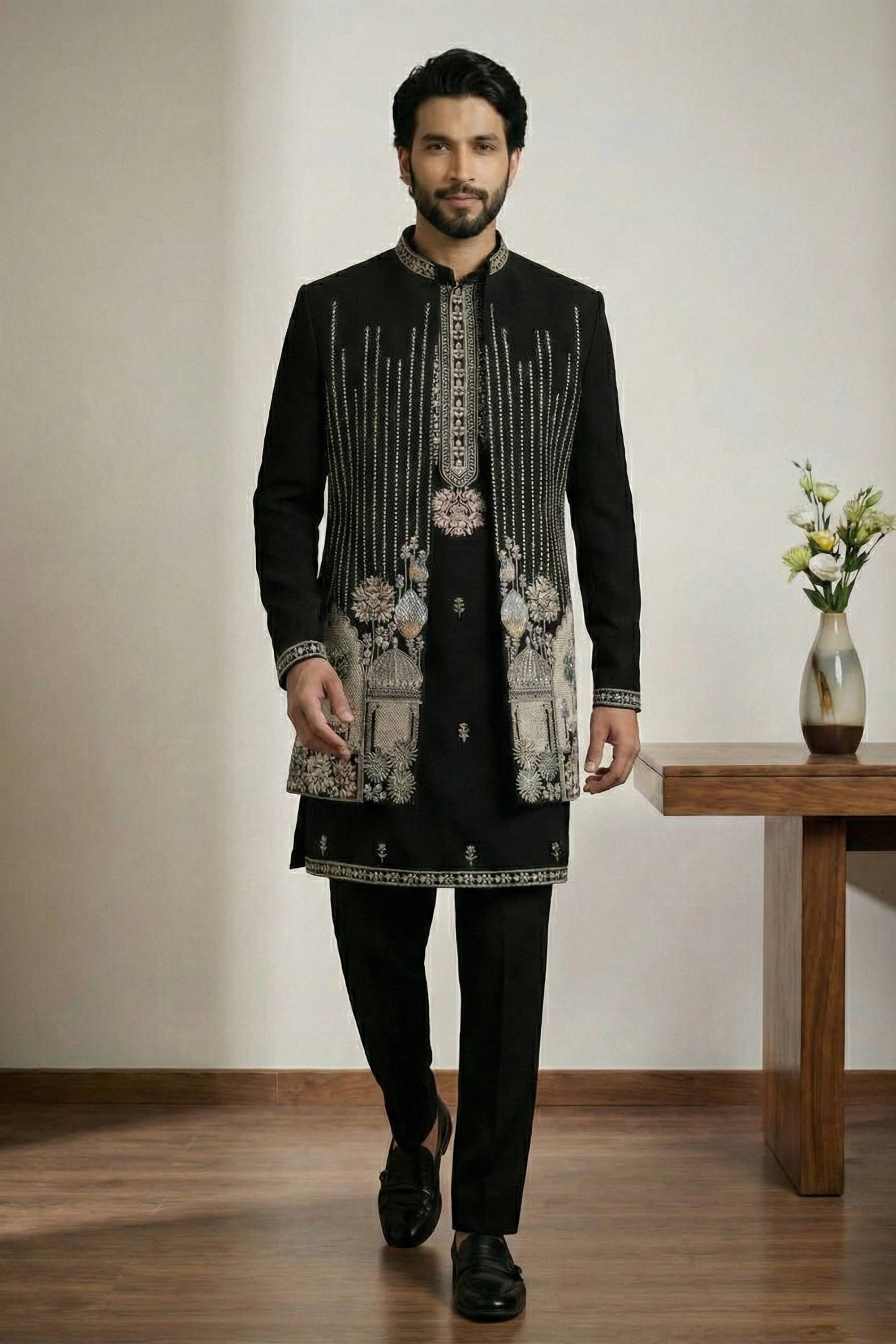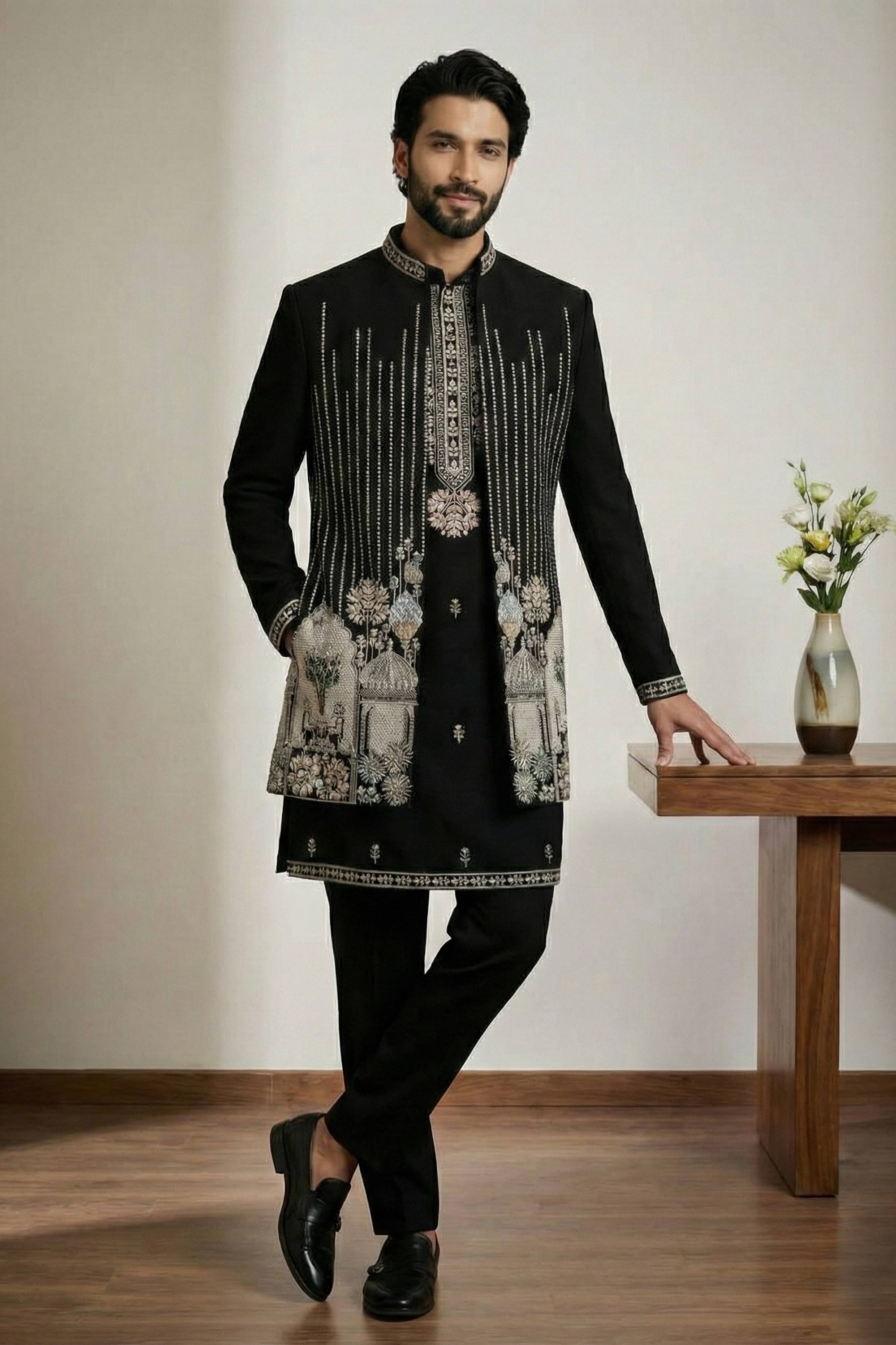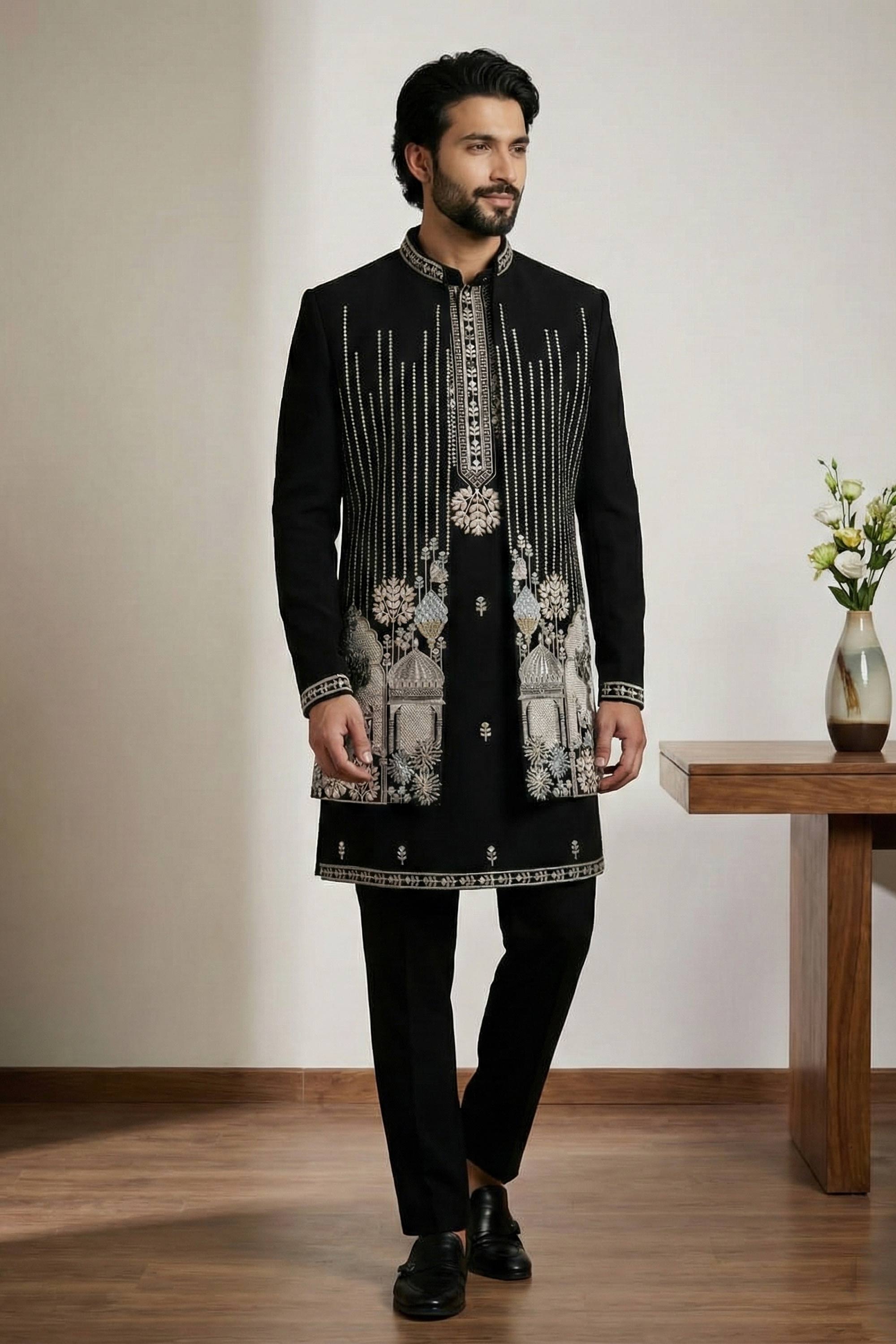 Satin Fabric Embroidered Black Wedding Wear Readymade Indo Western For Men