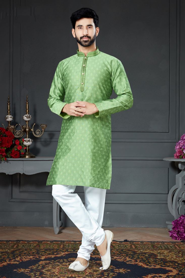 Sea Green Color Sangeet Wear Cotton Silk Fabric Designer Readymade Kurta Pyjama For Men