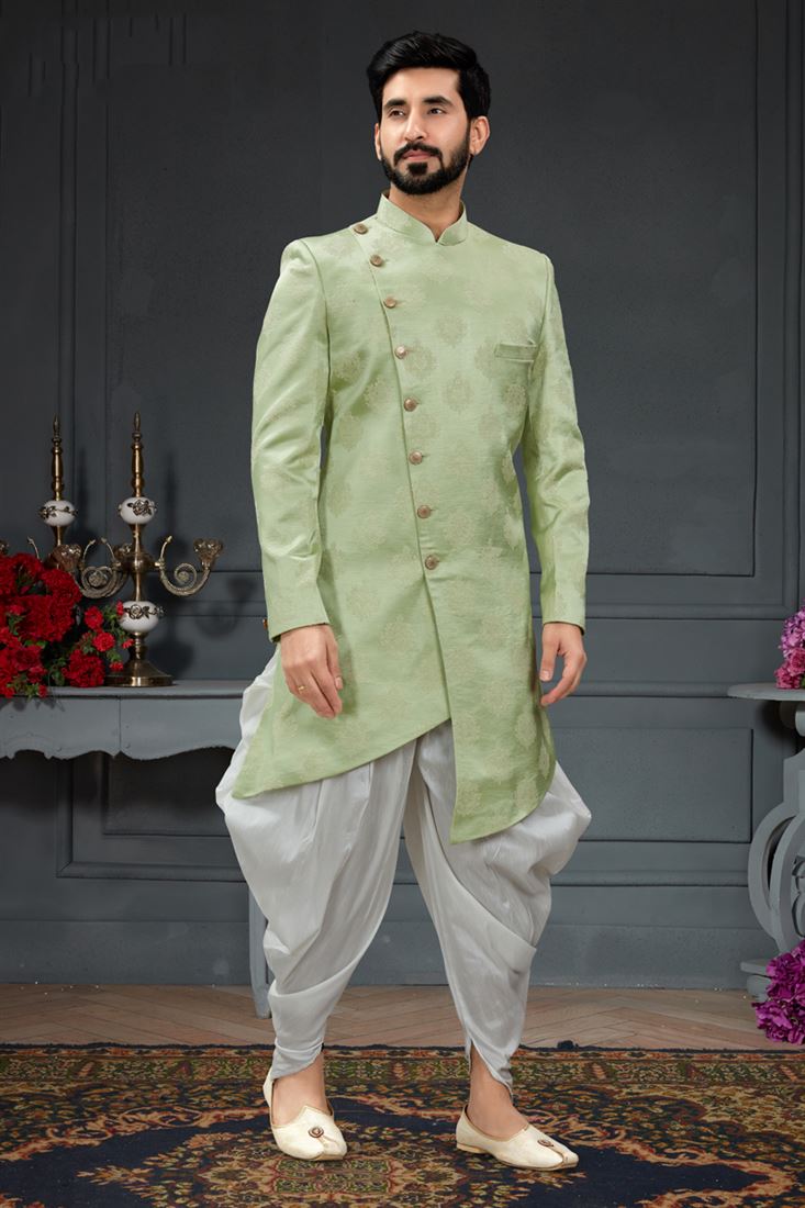 Sea Green Color Wedding Wear Pretty Dhoti Style Indo Western For Men In Jacquard Fabric
