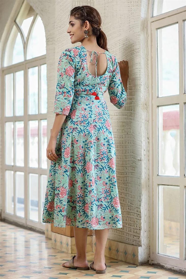 Sea Green Floral Printed Cotton Ethnic Kurti