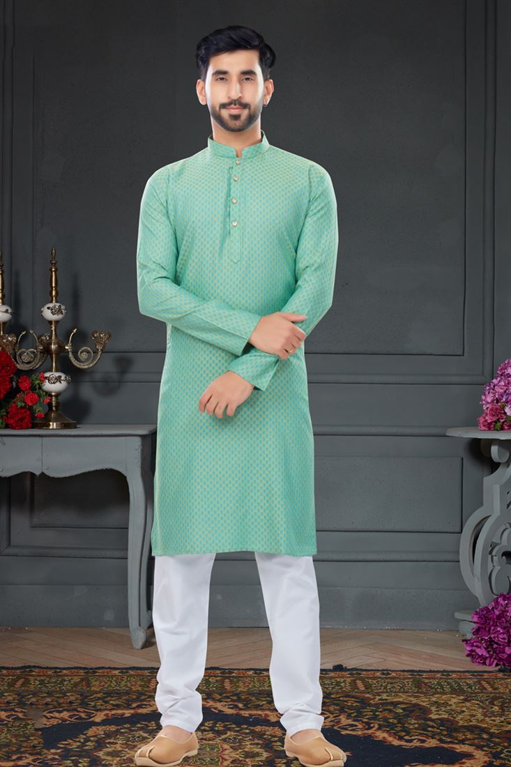 Sea Green Jacquard Work Kurta Pyjama For Men