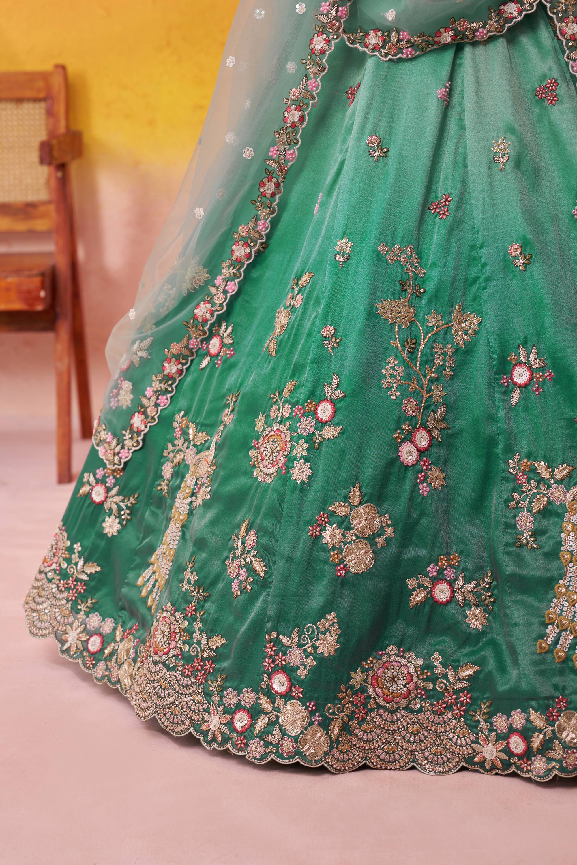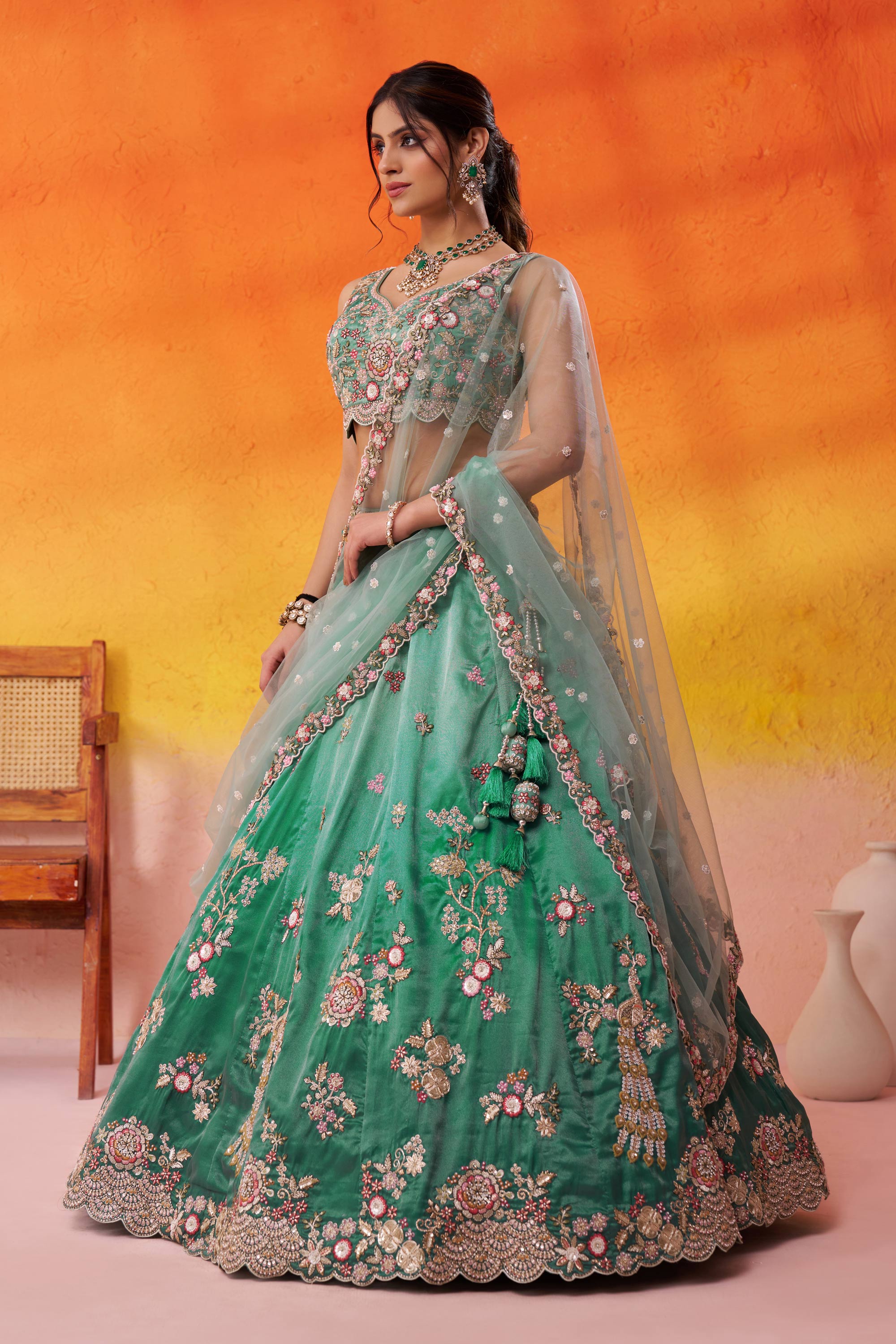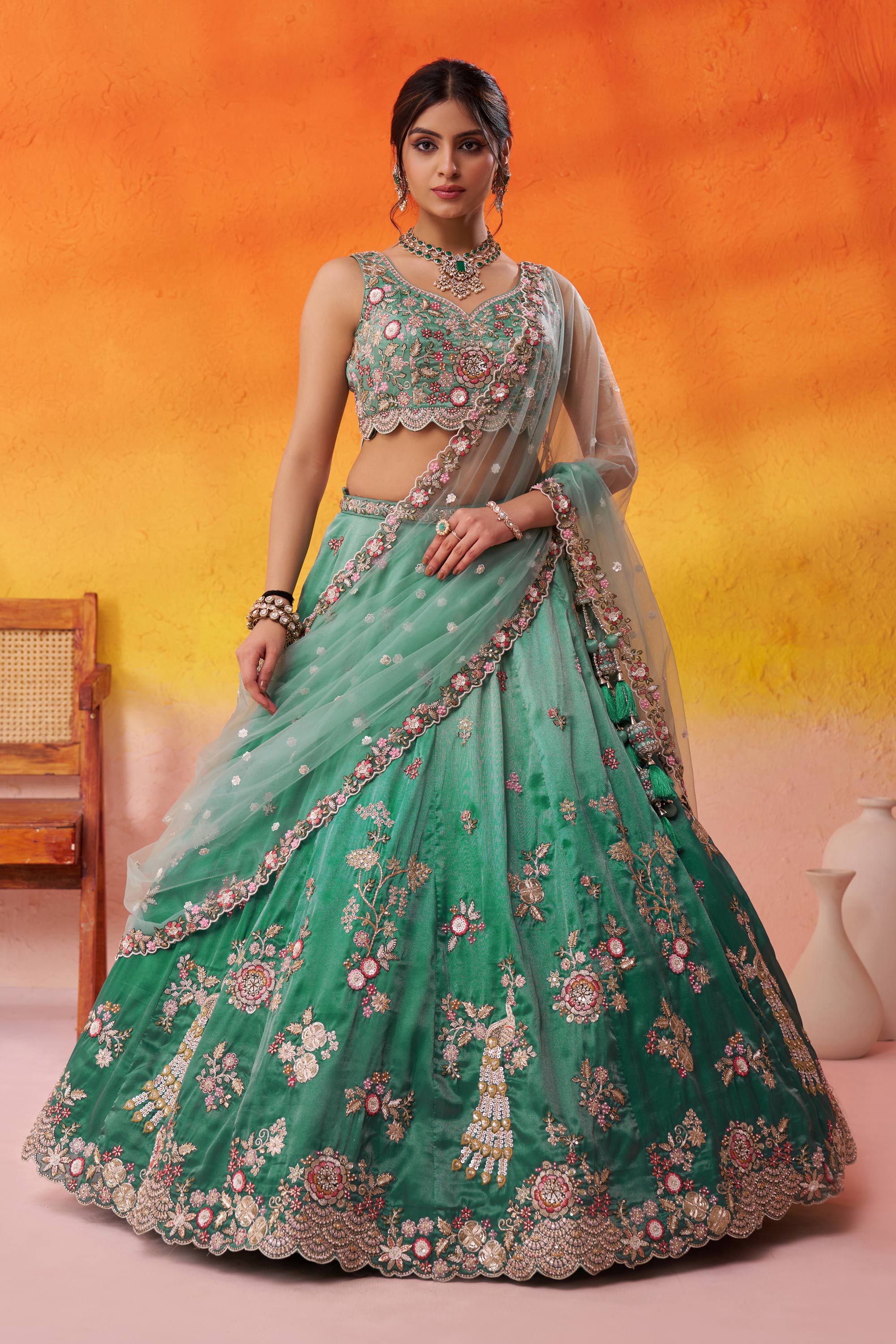 Sea Green Wedding Wear Tissue Embroidered Lehenga Choli