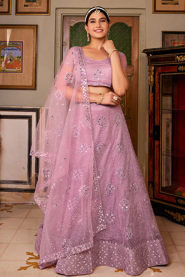 Sequins Work Net Fabric Function Wear Ravishing Lehenga In Lavender Color
