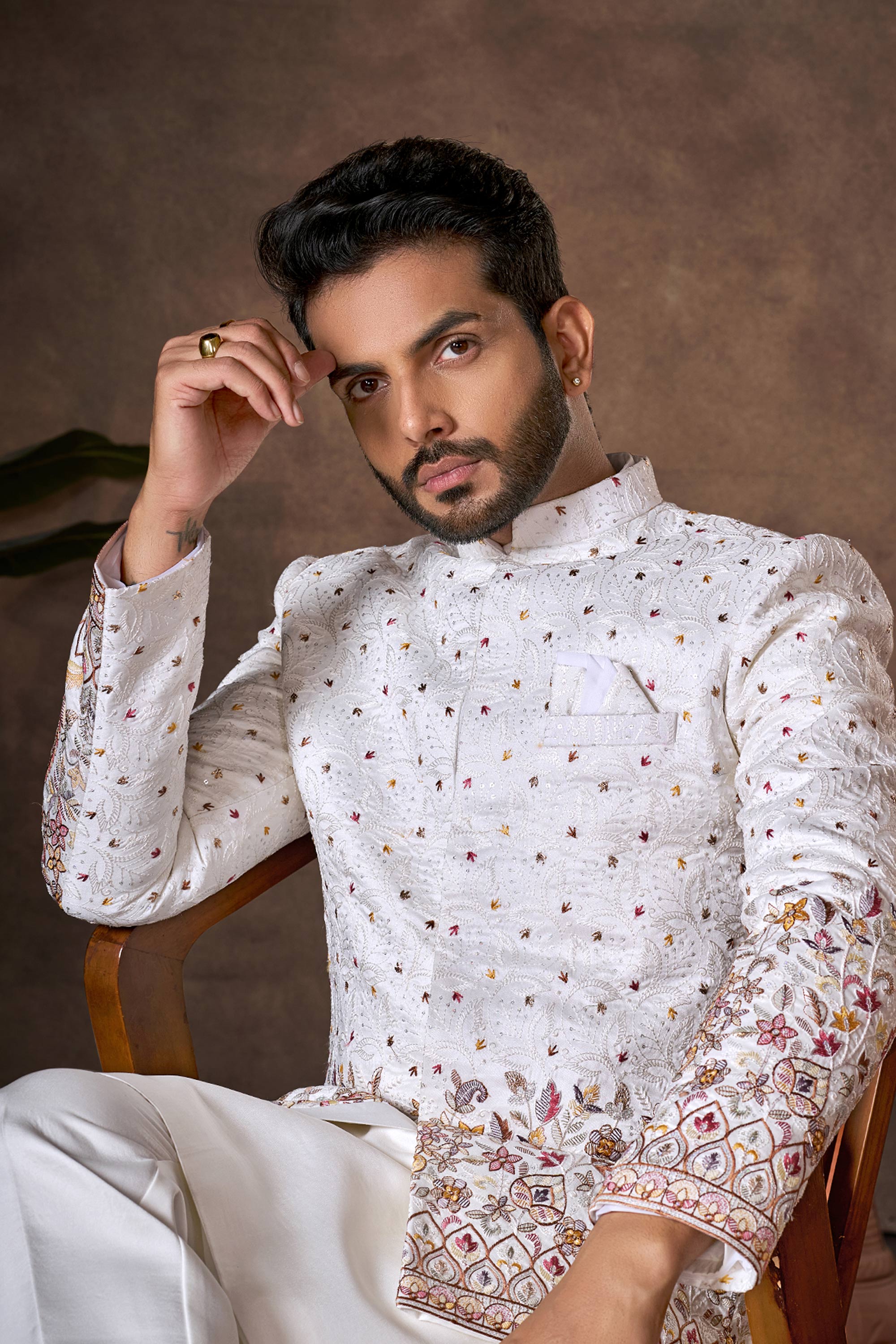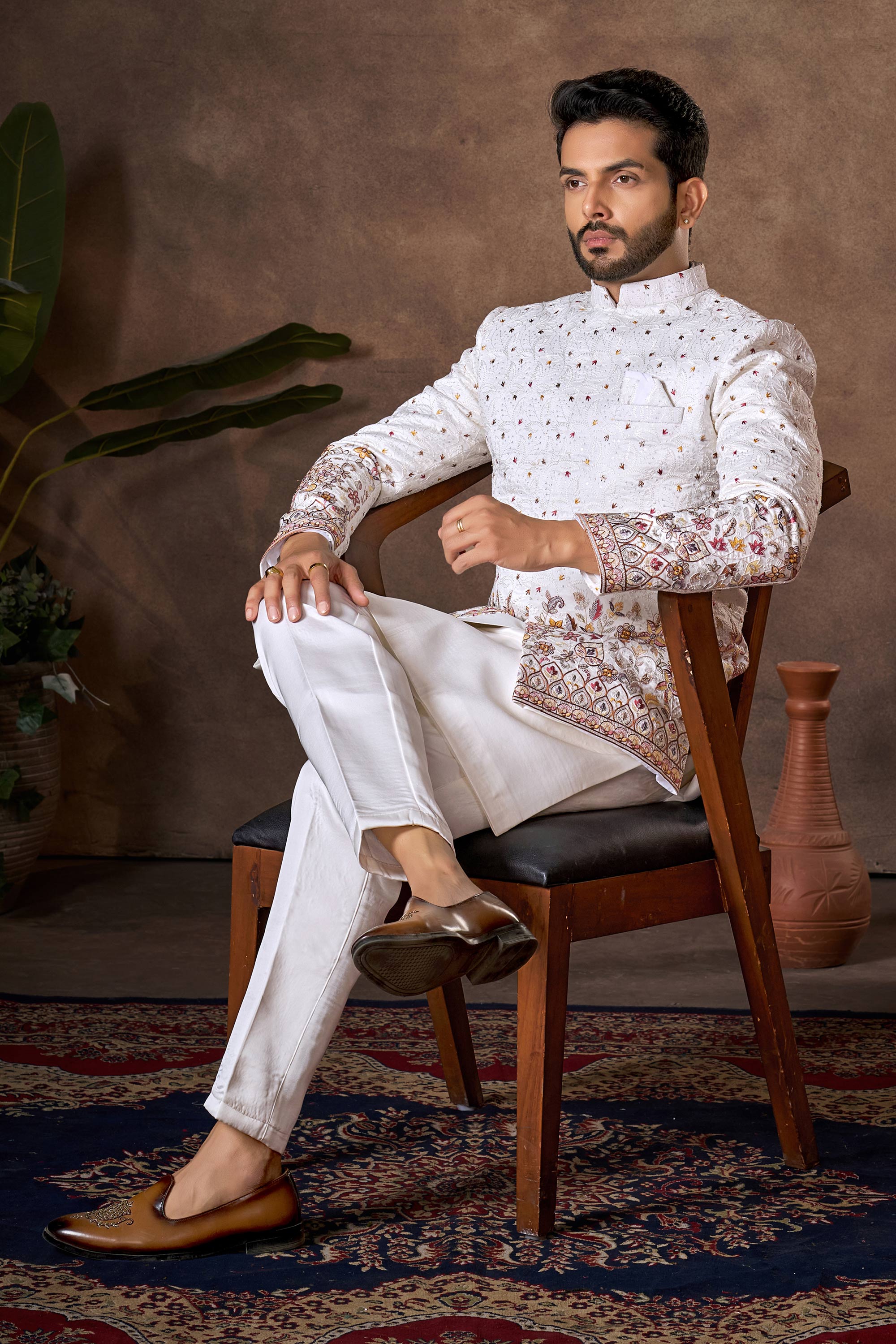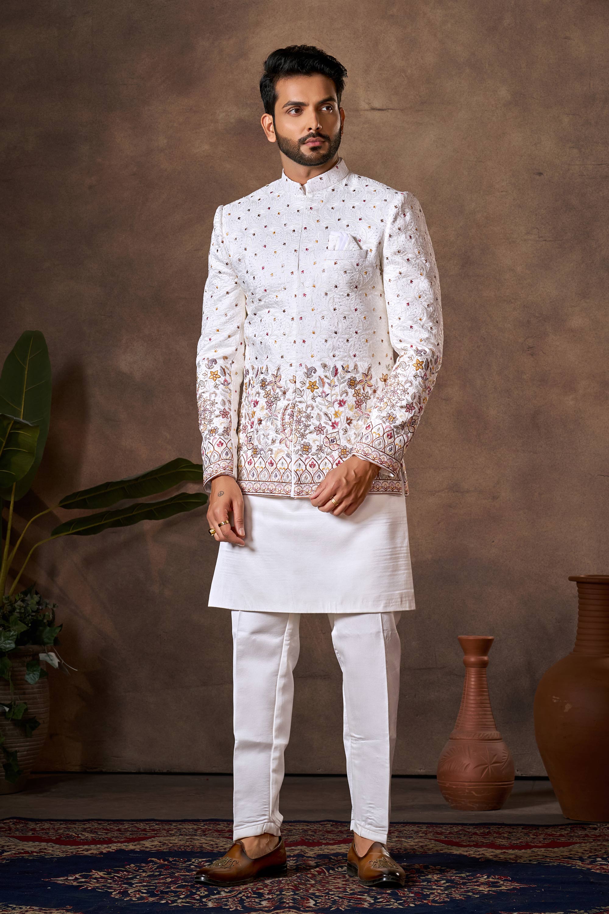 Silk Embroidered White Wedding Wear Readymade Indo Western For Men