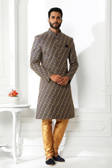 Silk Fabric Designer Heavy Embroidered Wedding Wear Readymade Sherwani For Men In Navy Blue Color