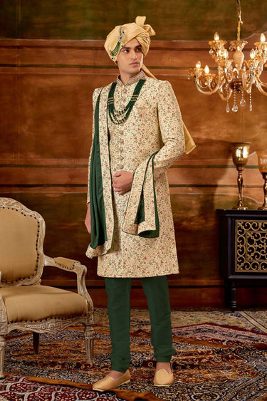 Silk Fabric Designer Wedding Wear Readymade Heavy Embroidered Groom Sherwani For Men In Beige Color With Stole