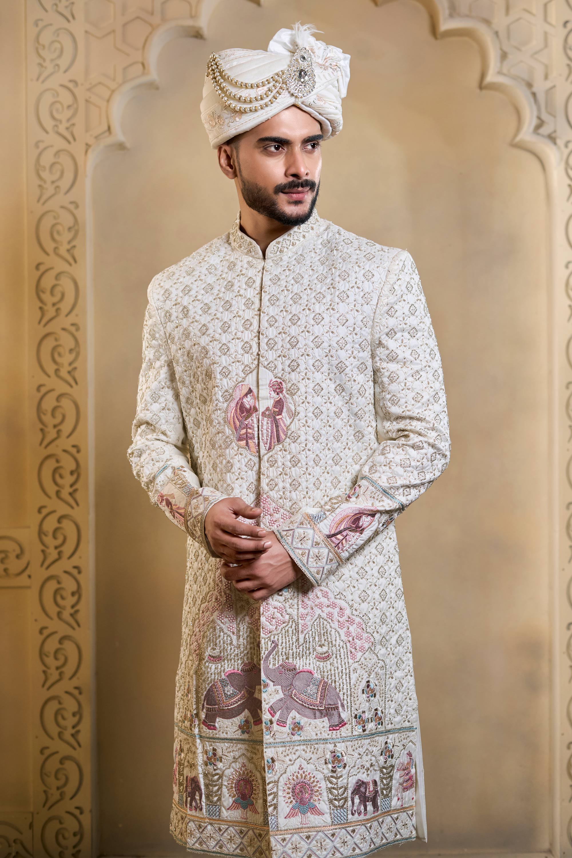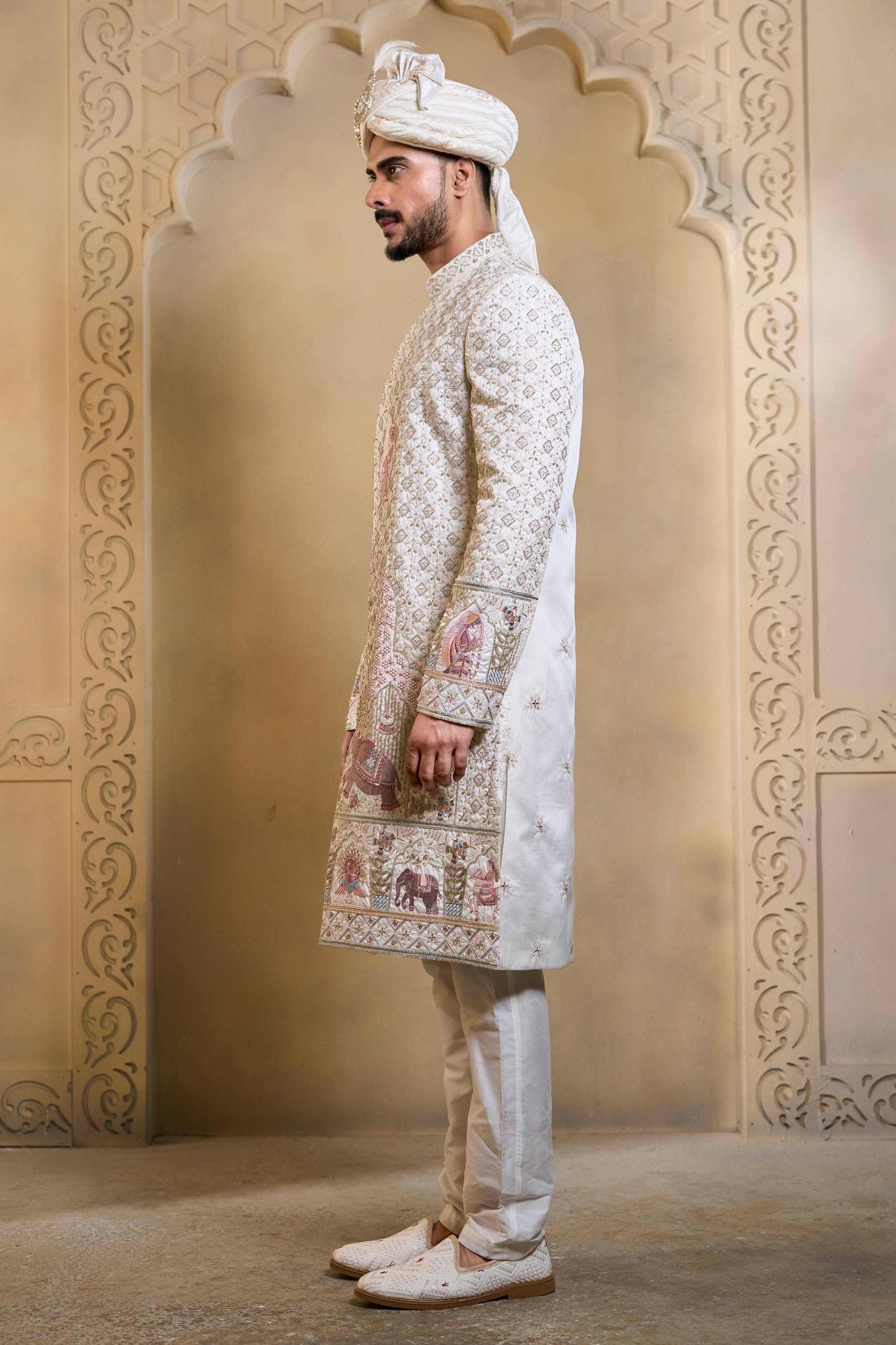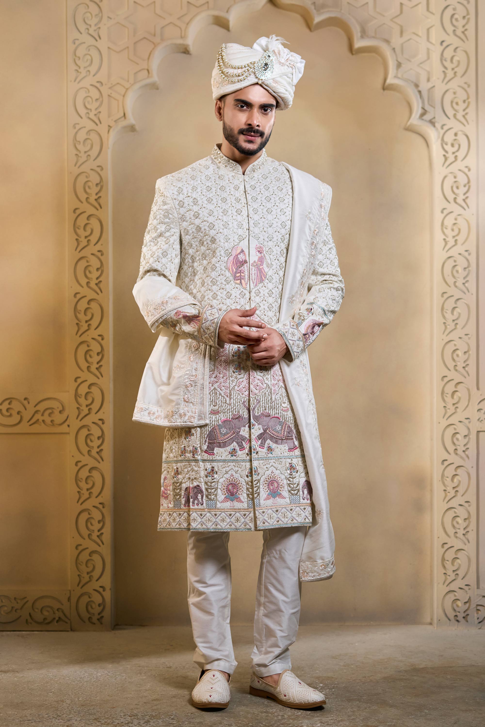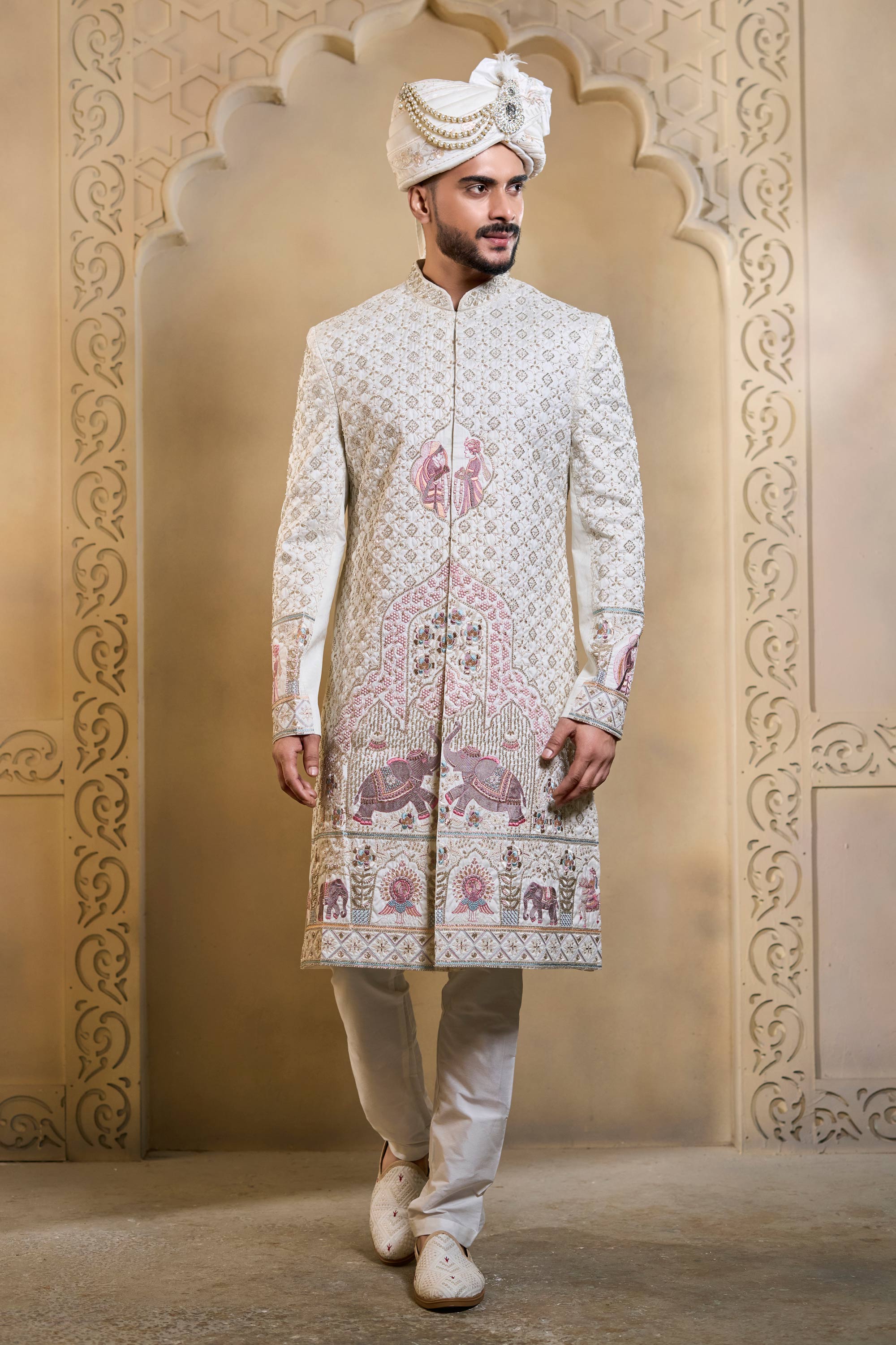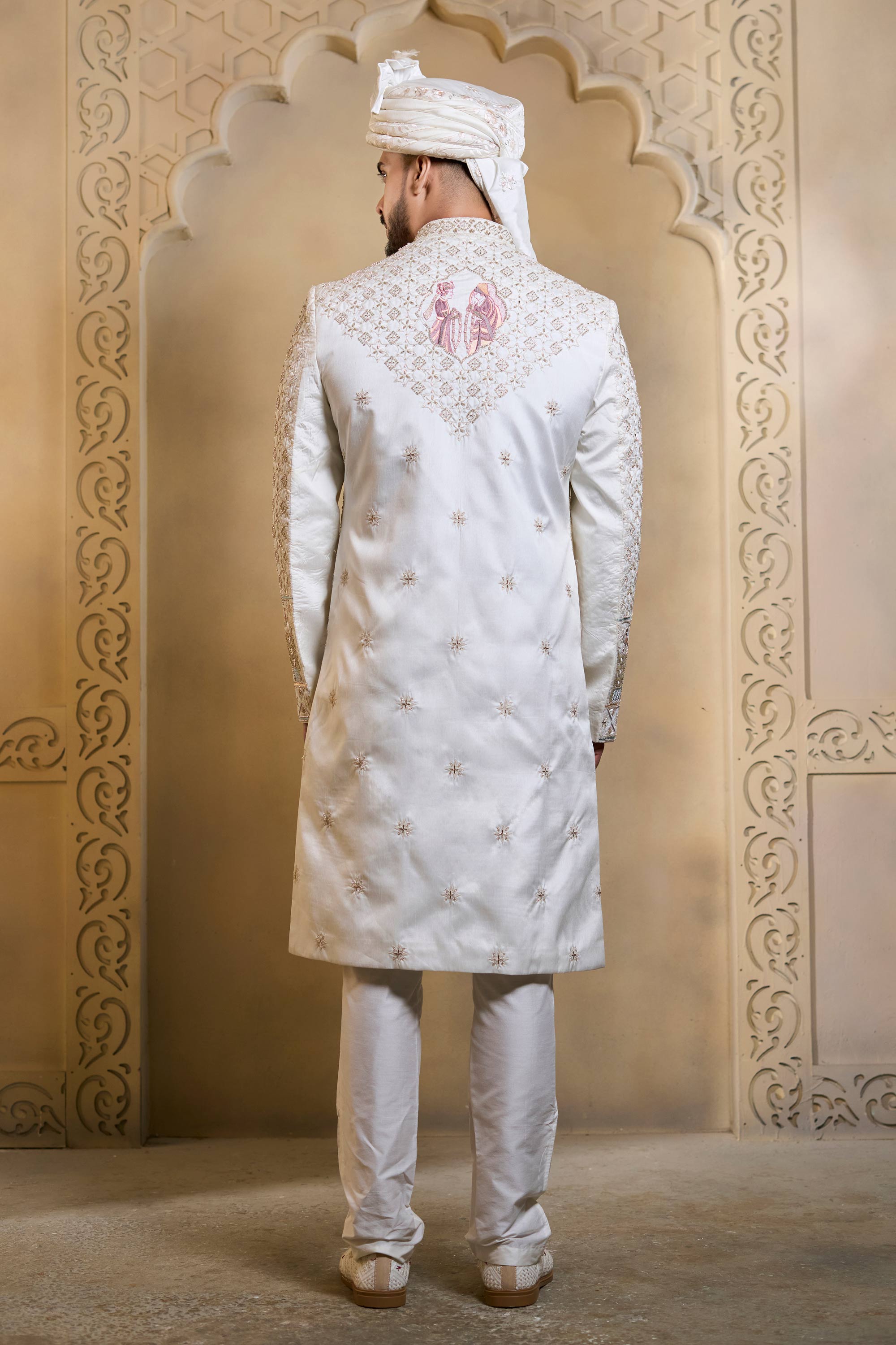 Silk Fabric Heavy Embroidered White Men Groom Sherwani