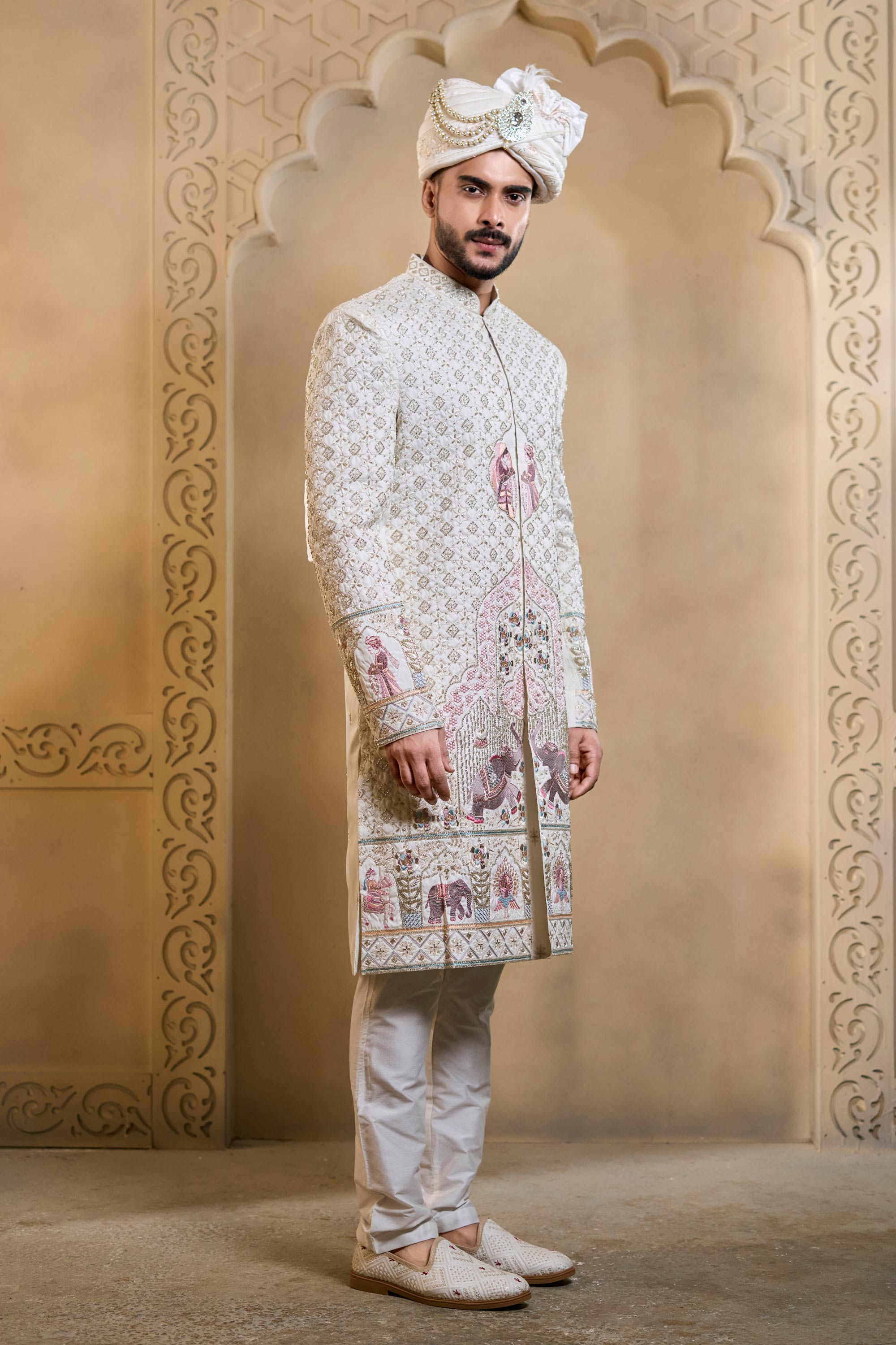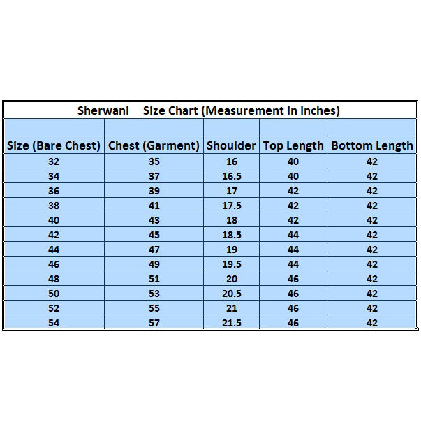 The sherwani features intricate embroidery work that enhances its regal appeal, adding fine detailing that highlights craftsmanship and tradition. Paired with a comfortable viscose bottom, this outfit ensures ease of movement while maintaining a polished and graceful look throughout the wedding functions. Note: Due to digital photography, slight color variations may occur.
