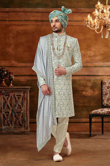 Silk Fabric Off White Color Wedding Wear Designer Readymade Heavy Embroidered Groom Sherwani For Men With Stole