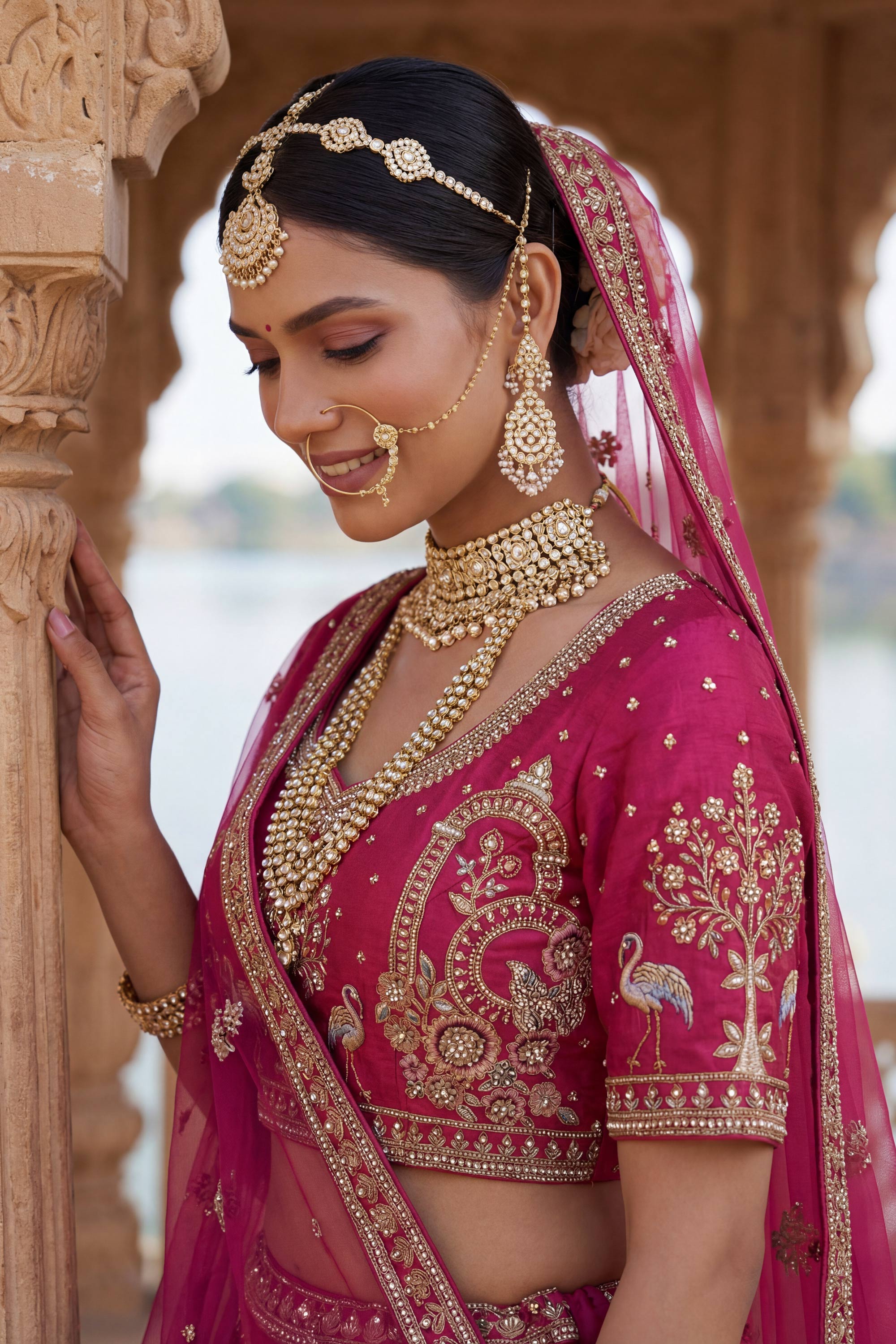 Look breathtakingly radiant on your big day with this beautifully crafted bridal lehenga choli. Designed from high-quality silk, the outfit is adorned with detailed embroidery patterns that enhance its charm. Its flattering fit offers both comfort and elegance, ensuring you can move confidently while keeping all attention on your glowing appearance. The lehenga comes with a complementing choli and a stunning dupatta that amplifies the outfit’s graceful design. Ideal for weddings, receptions, and other traditional events, this bridal lehenga choli is perfect for a bride seeking timeless fashion.
