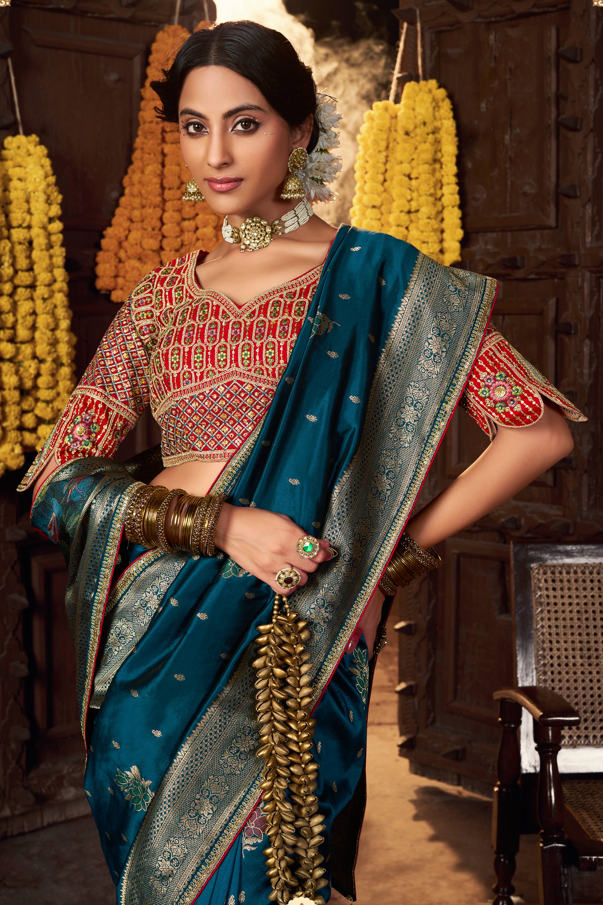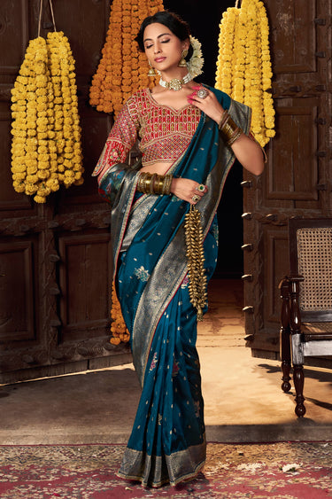 Silk Weaving Work Saree In Teal Color