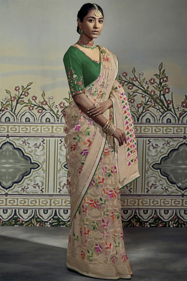 Skin Cream Color Organza Saree With Embroidery Work Blouse