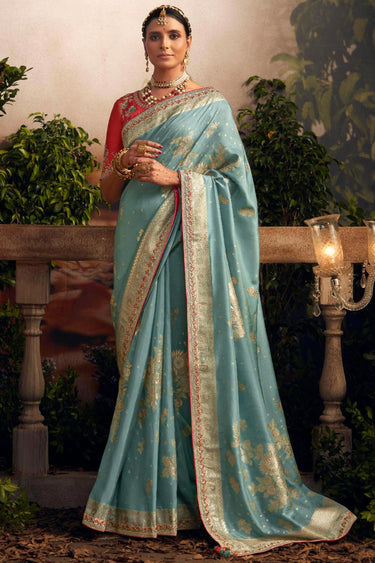 Sky Blue Color Art Silk Fabric Weaving Work Saree With Contrast Blouse