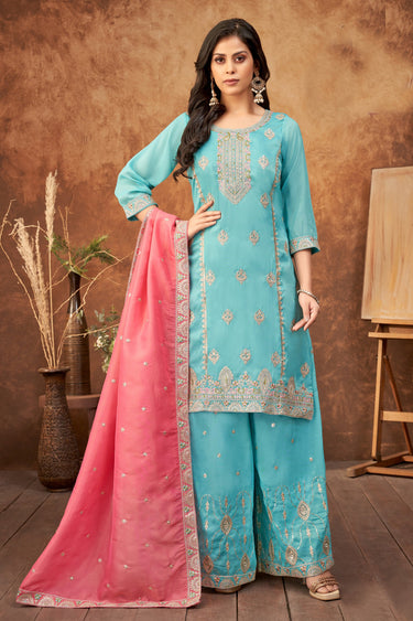 Sky Blue Embroidered Silk Designer Readymade Palazzo Salwar Suit