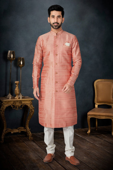 Slub Jacquard Rust Color Wedding Wear Readymade Indo Western Suit For Men