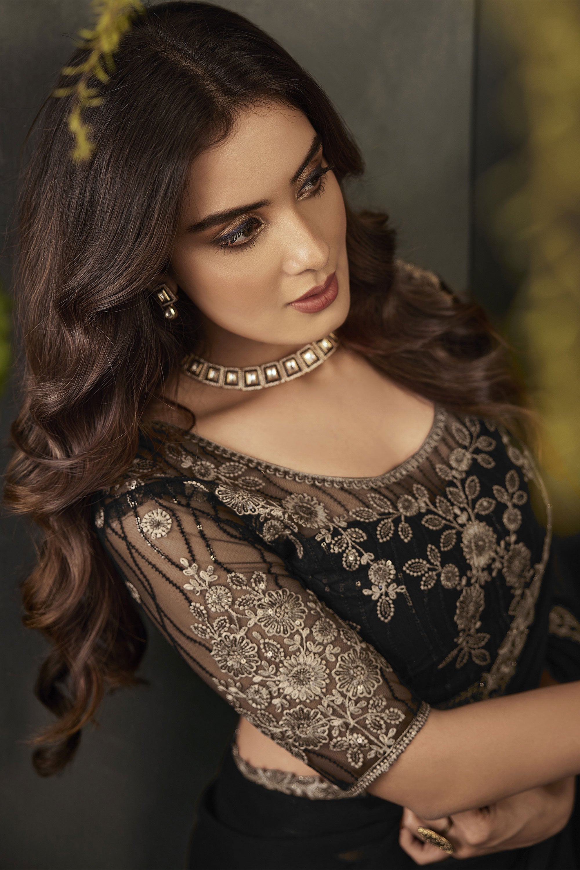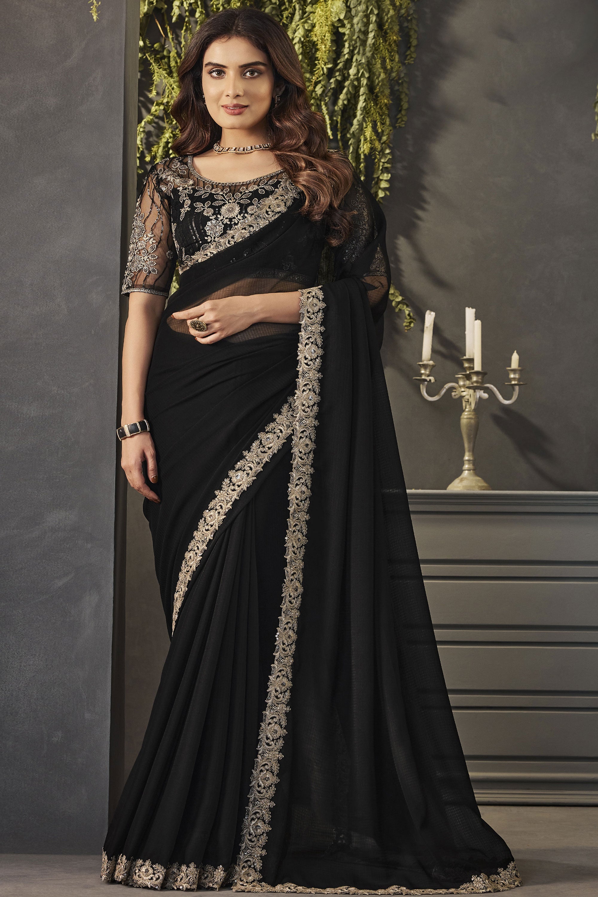 Smashing Black Color Lace Border Work Georgette Fabric Saree With Embroidered Blouse