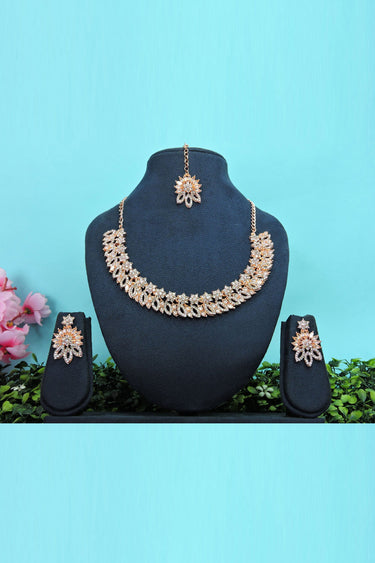 Solid Alloy Material Necklace Set Earrings And Mang Tikka For Women In Golden Color