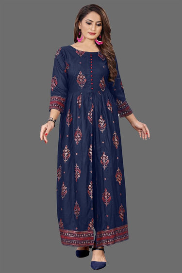 Splendid Navy Blue Color Casual Wear Foil Printed Work Readymade Kurti In Rayon Fabric