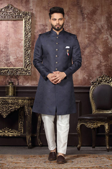 The Navy Blue Readymade Indo Western outfit is perfect for wedding, receptions, and other festive occasions. Its timeless appeal and fusion of traditional and contemporary styles make it suitable for men of all ages and preferences.