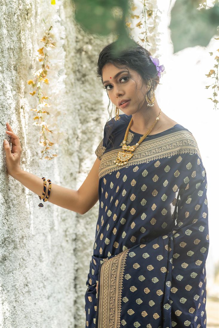Stunning Navy Blue Color Weaving Work Banarasi Silk Saree
