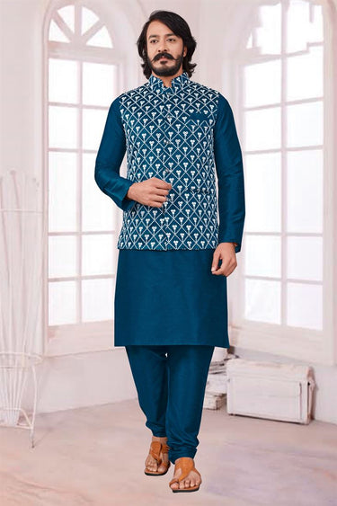 Stunning Teal Color Art Silk Fabric Festive Wear Readymade Kurta Pyjama With Trendy Jacket