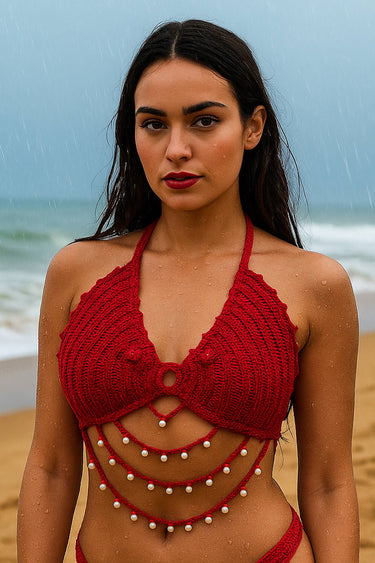 Stylish Glamorous Red Cotton Crochet Bikini Top Durable And Breathable