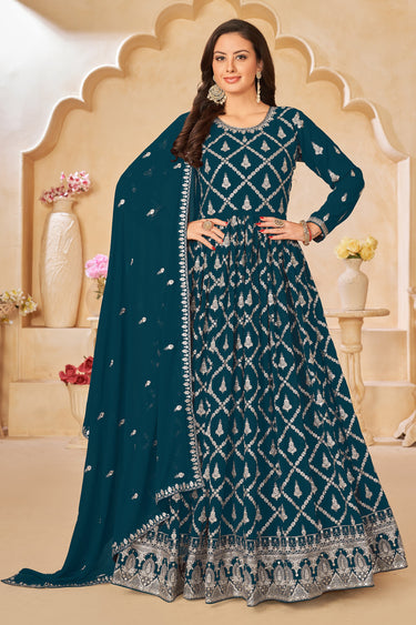Teal Color Festive Wear Embroidered Long Anarkali Salwar Suit In Georgette Fabric
