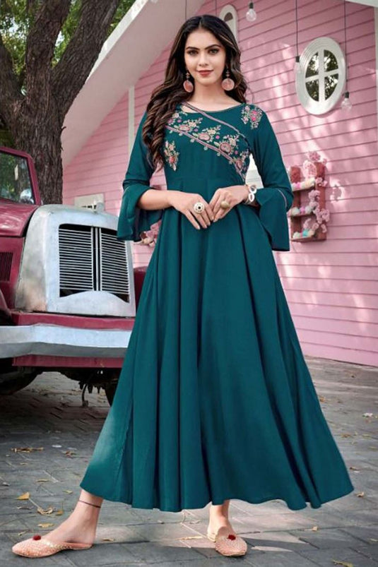 Teal Color Rayon Fabric Casual Wear Embroidered Work Readymade Sober Kurti