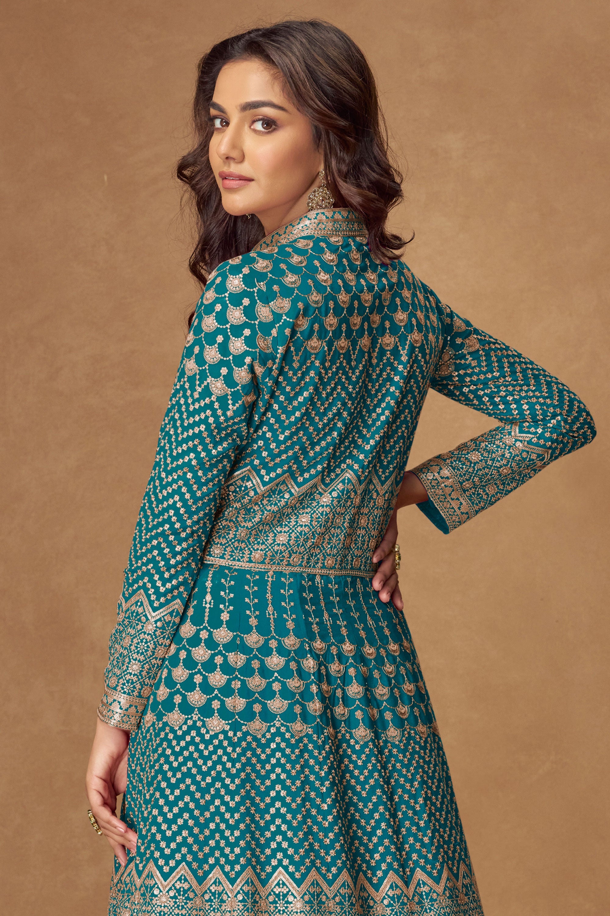 Teal Embroidered Wedding Wear Long Top With Skirt